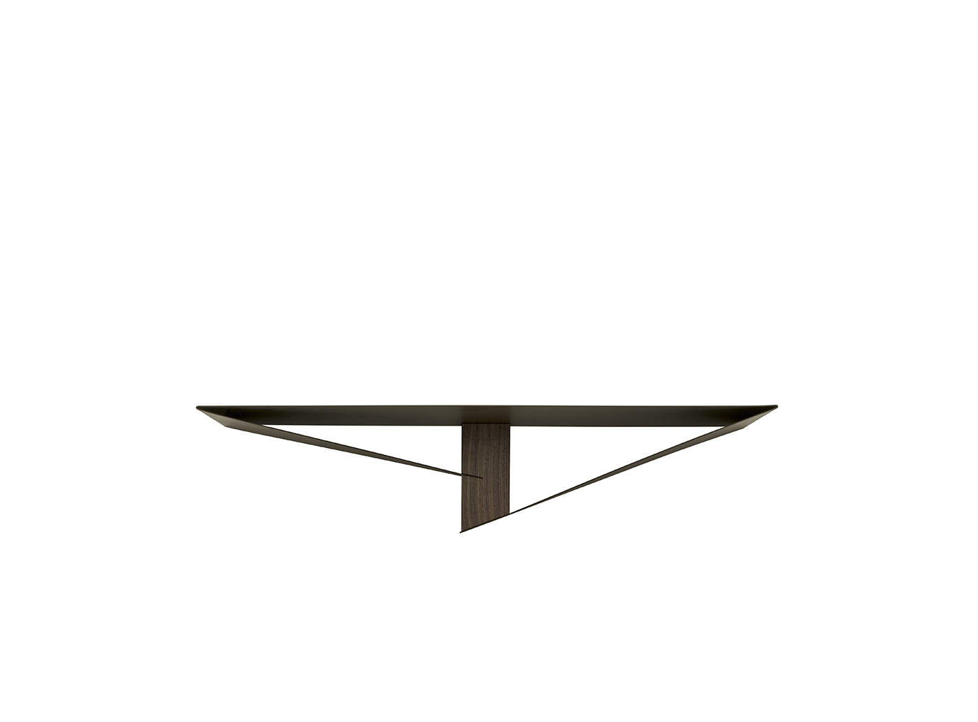 Two curved metal wings meet in a solid wood joint, creating a decoration for the wall against which they stand. Albatross console table and shelf are perfect for different interiors, thanks to the range of colors available. Stone bronze, white varnished and pink powder finishes manage to make every piece look extremely different from the other.