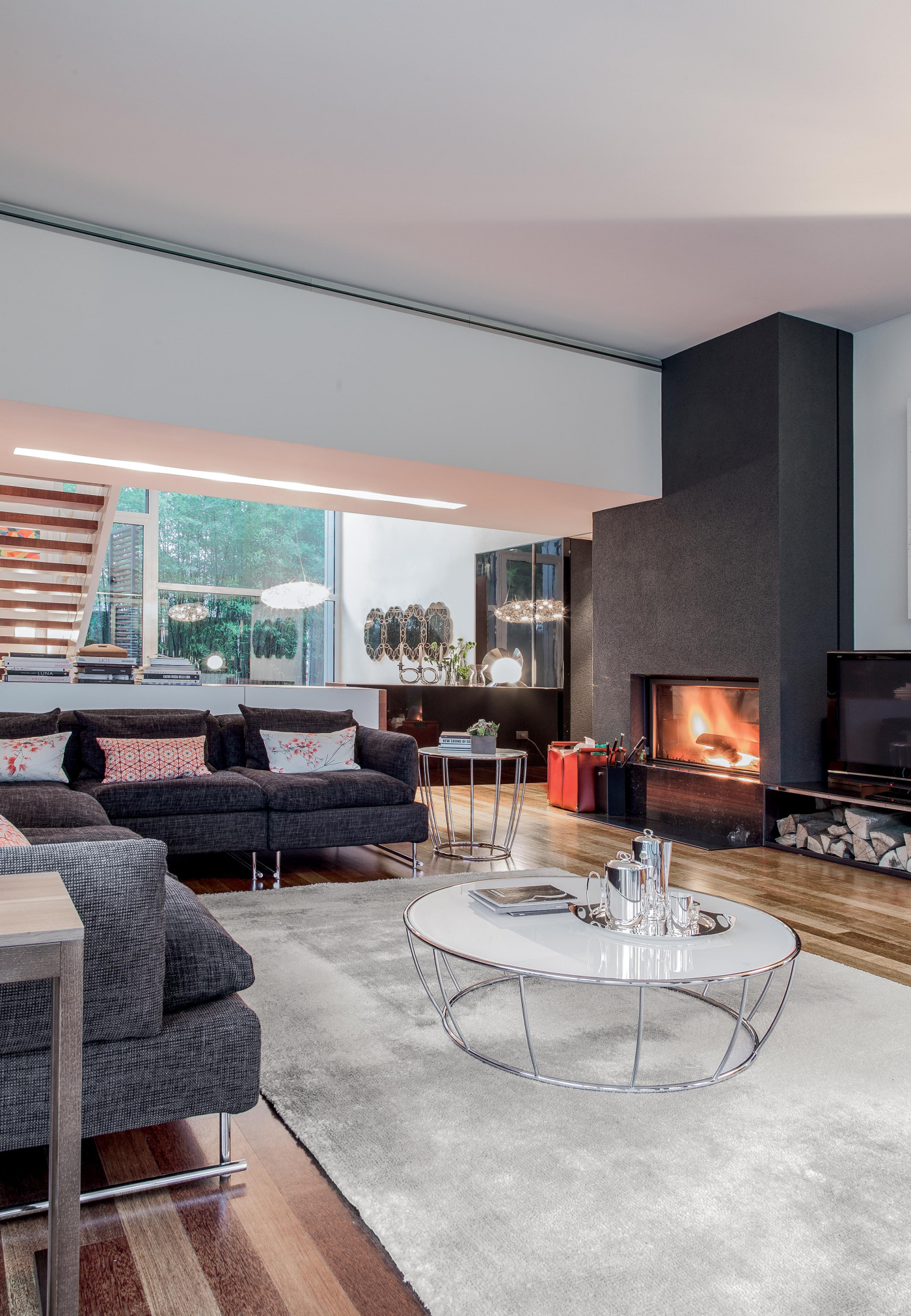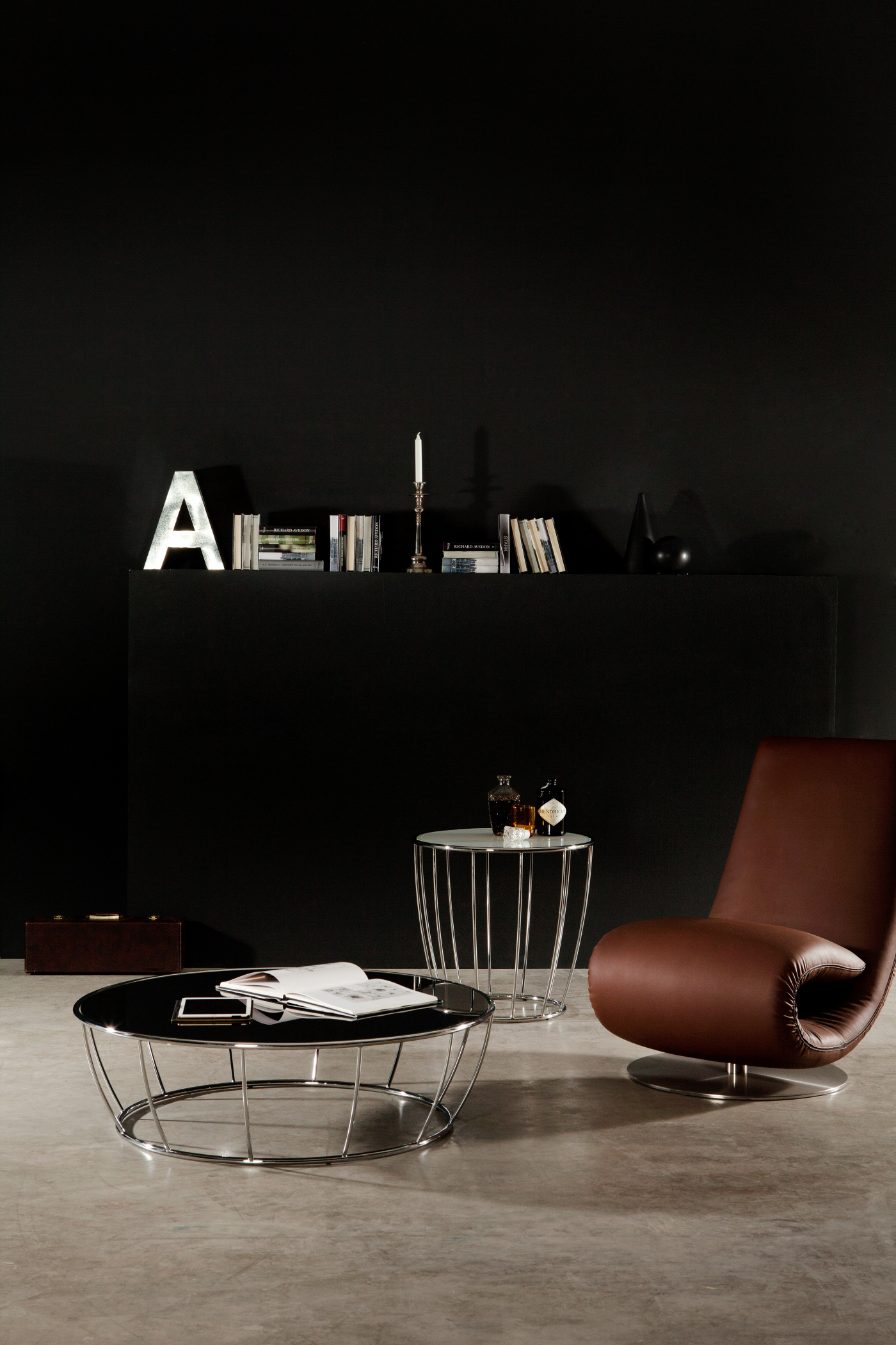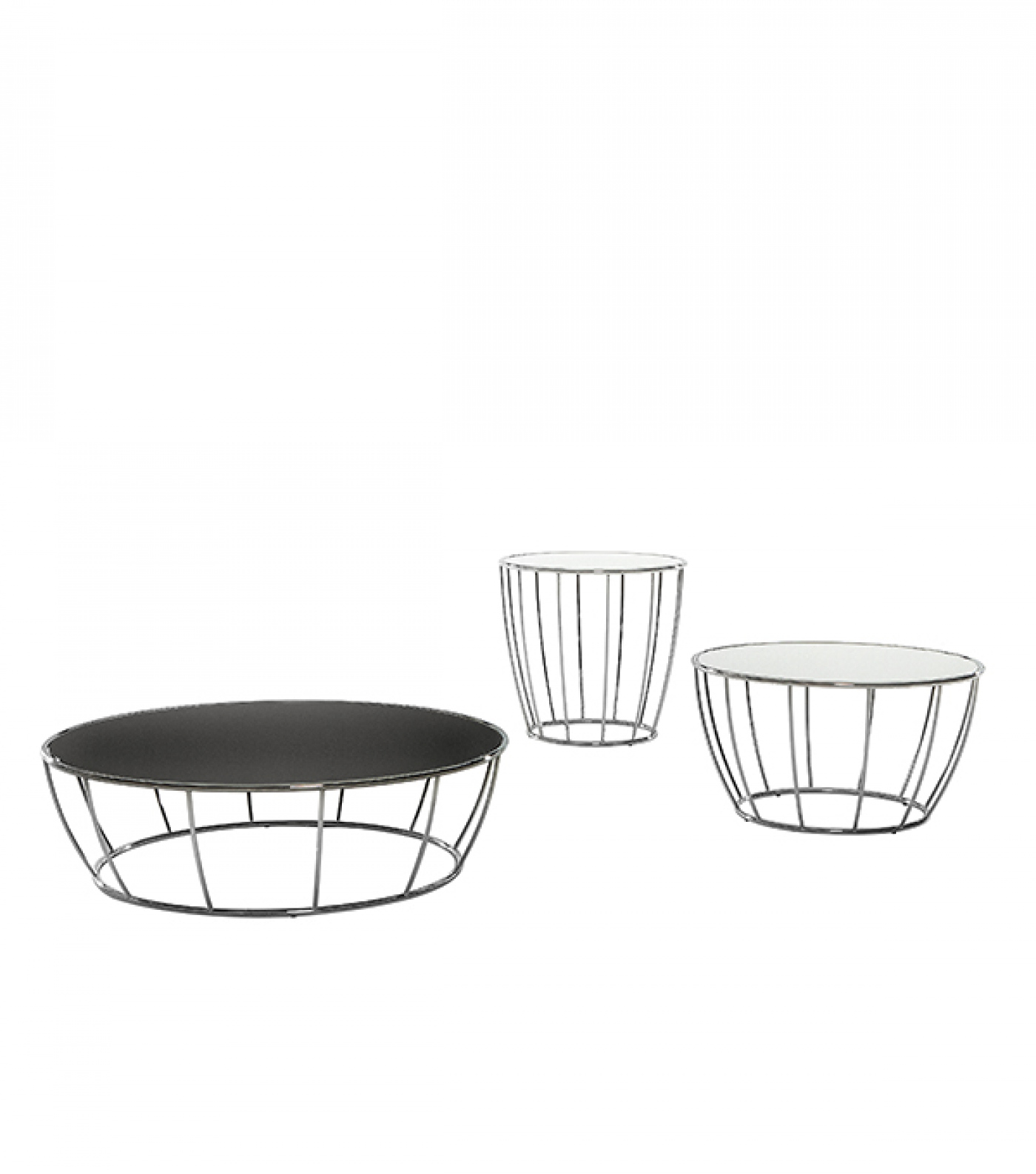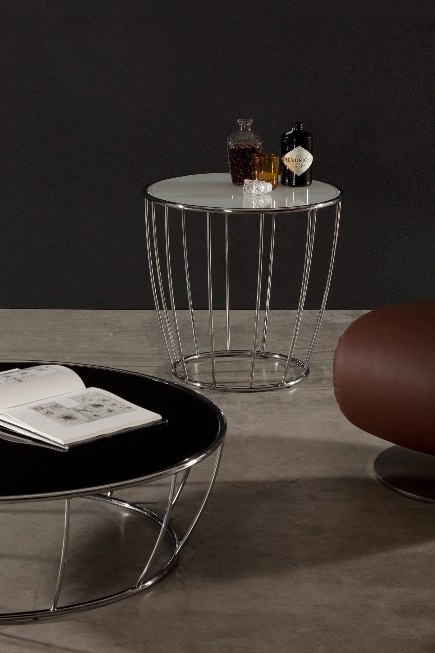 Amburgo coffe and side-tables play with smooth lines, a space that gets lightened by the structure's empty spaces. The chromed, or stone bronze metal tubes go up to hold the black, white, beige tempered glass, or the porcelain stoneware top.