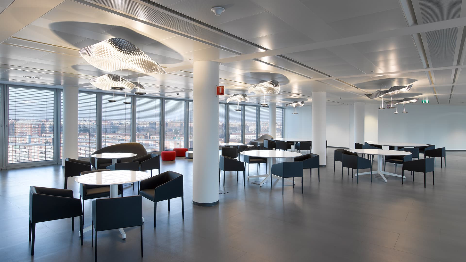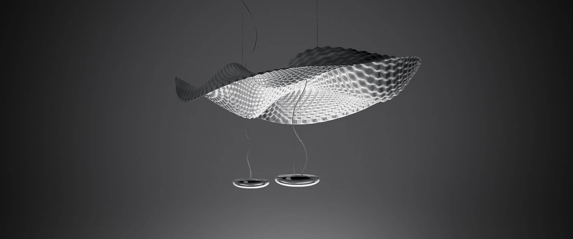 “My concept way to freeze a moment that seemed to be created by air rolling over a thin sheet , achieving a very natural flow and rhythm in the lightweight sculptural skin. Ultimately it appears to be suspended in anti gravity on a cushion of air….like the cosmos in the complex forms and geometries that seem to defy explanation and create a sense of infinity.” Materials: body lamp - reflector made of thermoplastic material; die-cast aluminium lighting units; upper diffuser in opal methacrylate.