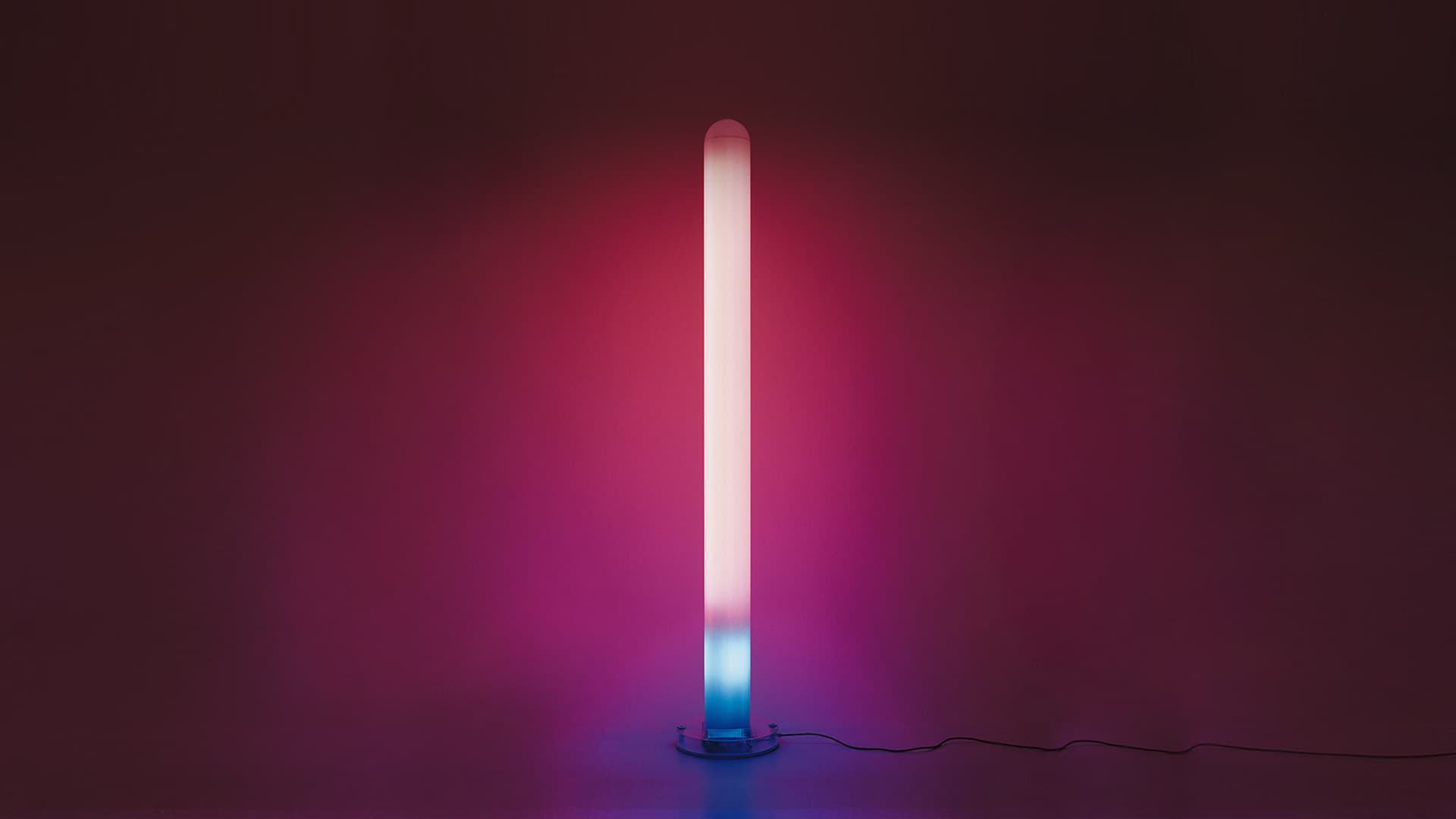 The fitting uses RGB sources allowing the creation of a wide range of coloured light atmospheres. Using a remote control the user can manage 10 standard atmospheres, create and save 10 more and adjust the light intensity. The selected atmosphere can be visualized on a display located on the base of the fitting. A blue light near the base marks the presence of the lamp.