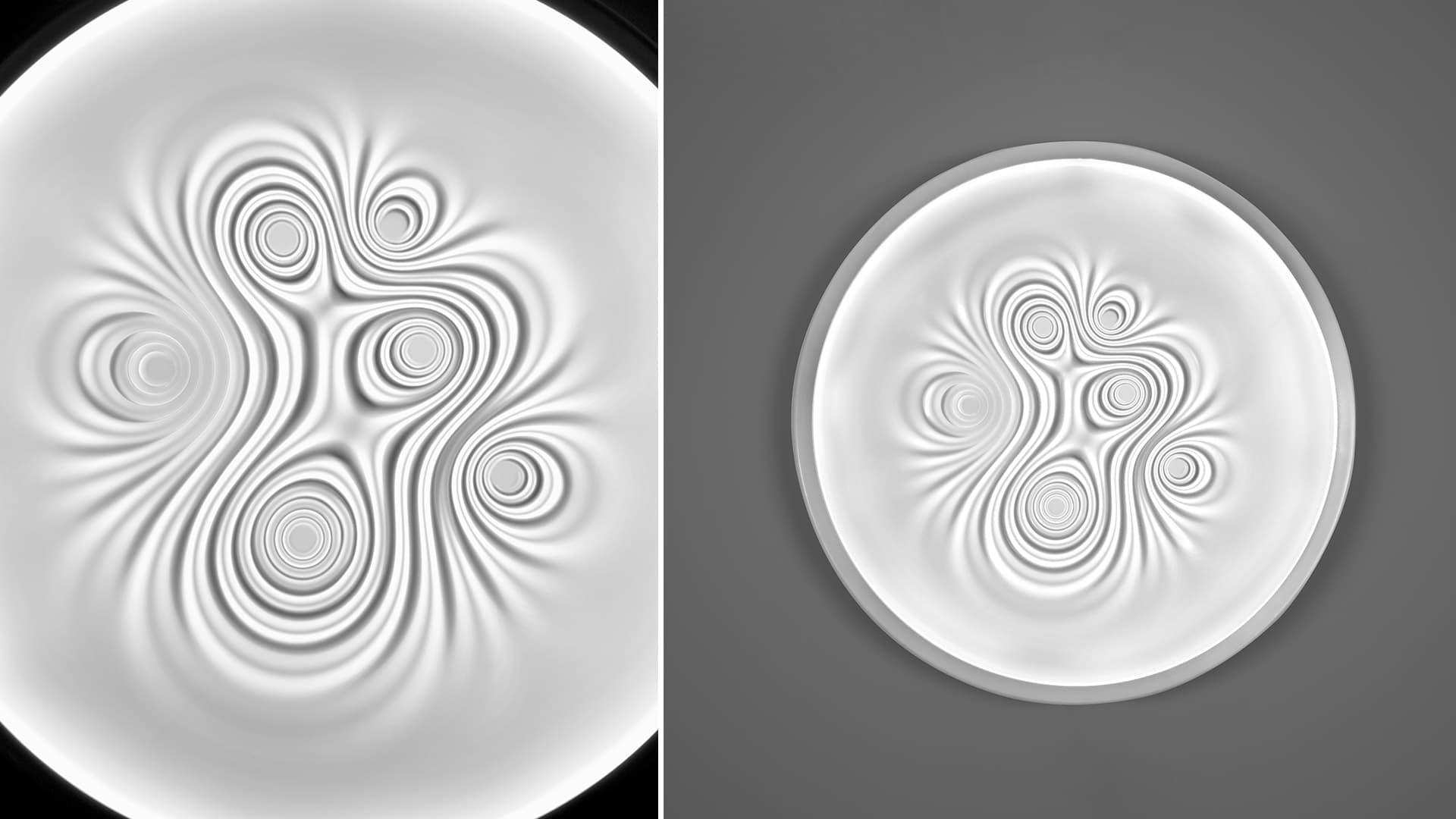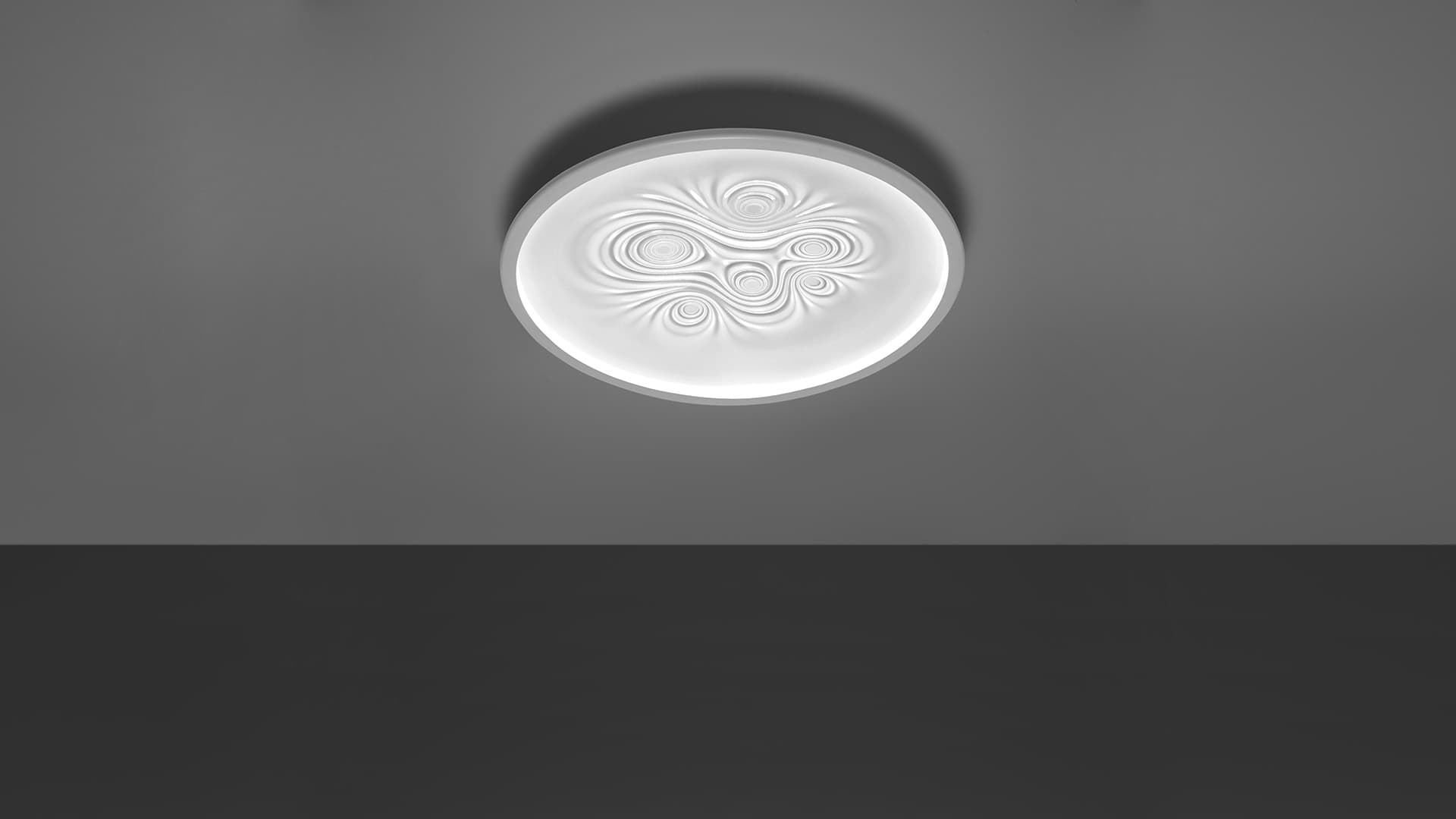 "Generated from advanced parametric scripting the vortices act as light capturing forms, emitting a glowing light phenomena from a ring of LEDs located in its circumference. Intended for mounting in either singular or multiple clusters across walls or ceilings ".Ross Lovegrove
