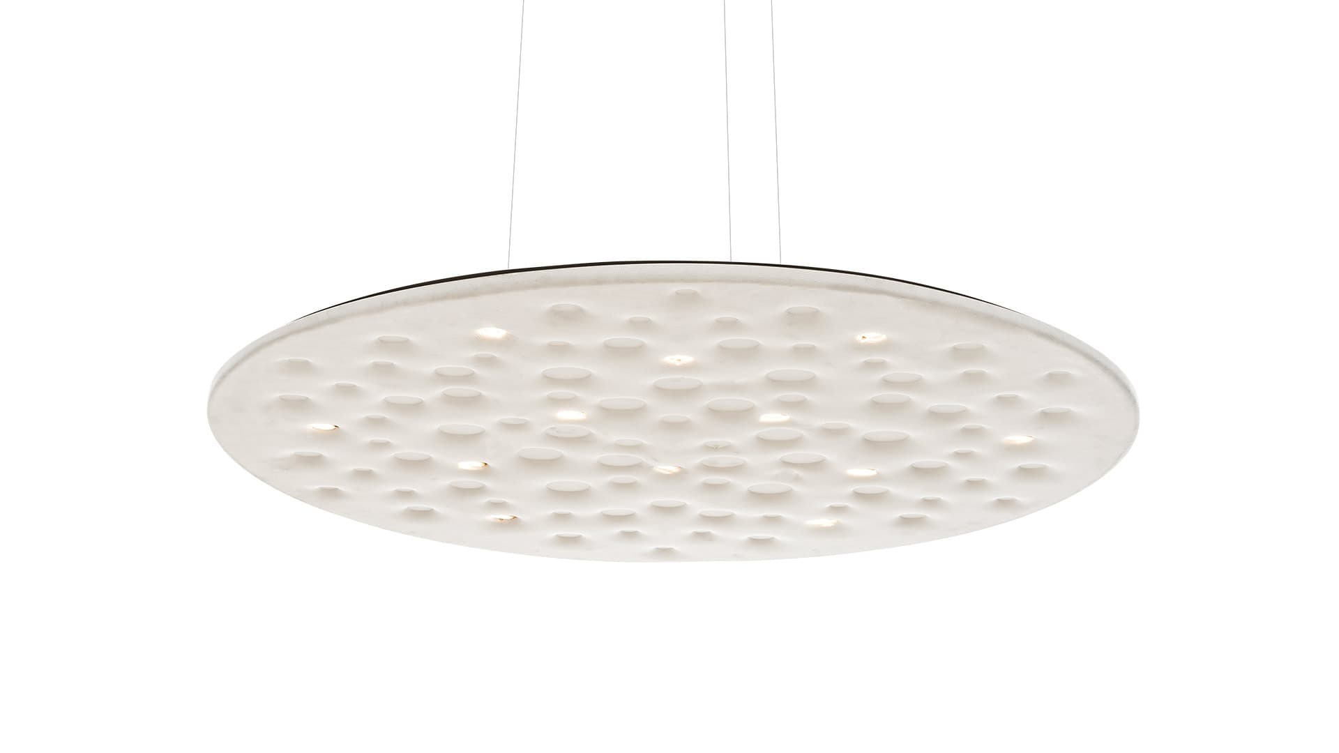 Suspension appliance with sound absorption properties: the material’s characteristics and the appliance’s geometry ensure a reduced reverberation time.The sound absorption effect is optimized for the frequencies of human voice.The varying densities of the material used for the lower panel promote the absorption of different frequencies.Both the upper and the lower surface of the appliance feature sound-absorbing properties. Appropriate positioning of the appliance in space is crucial to optimize sound absorption.