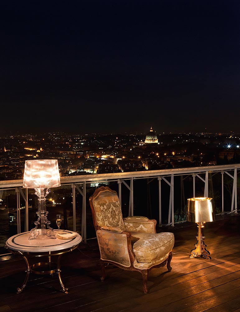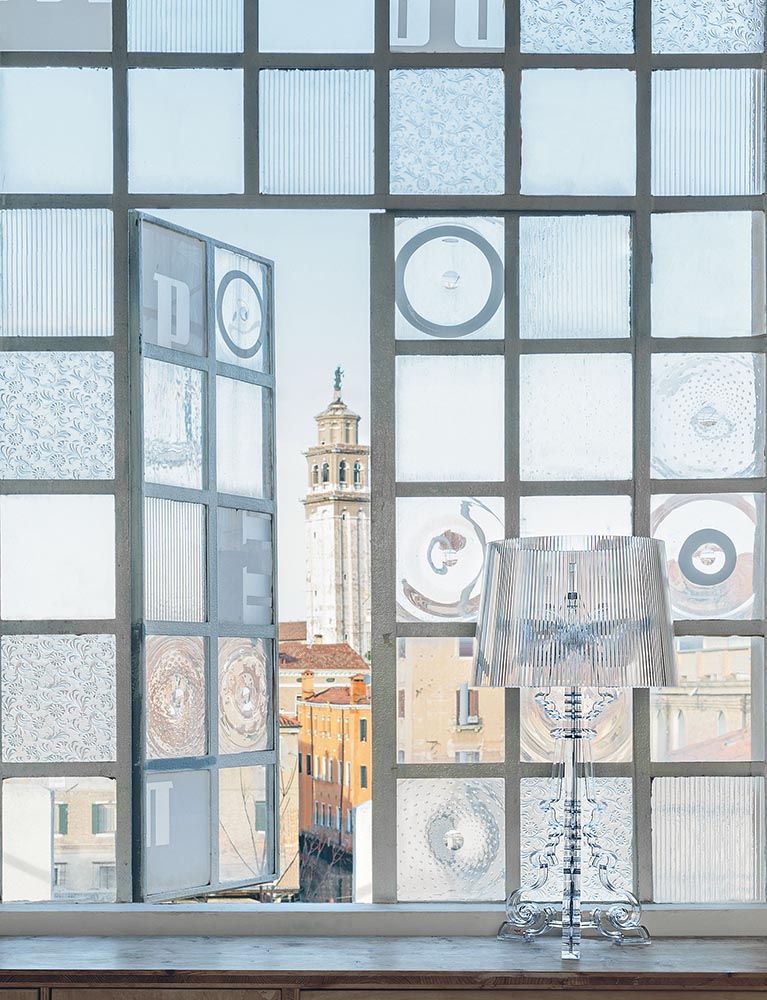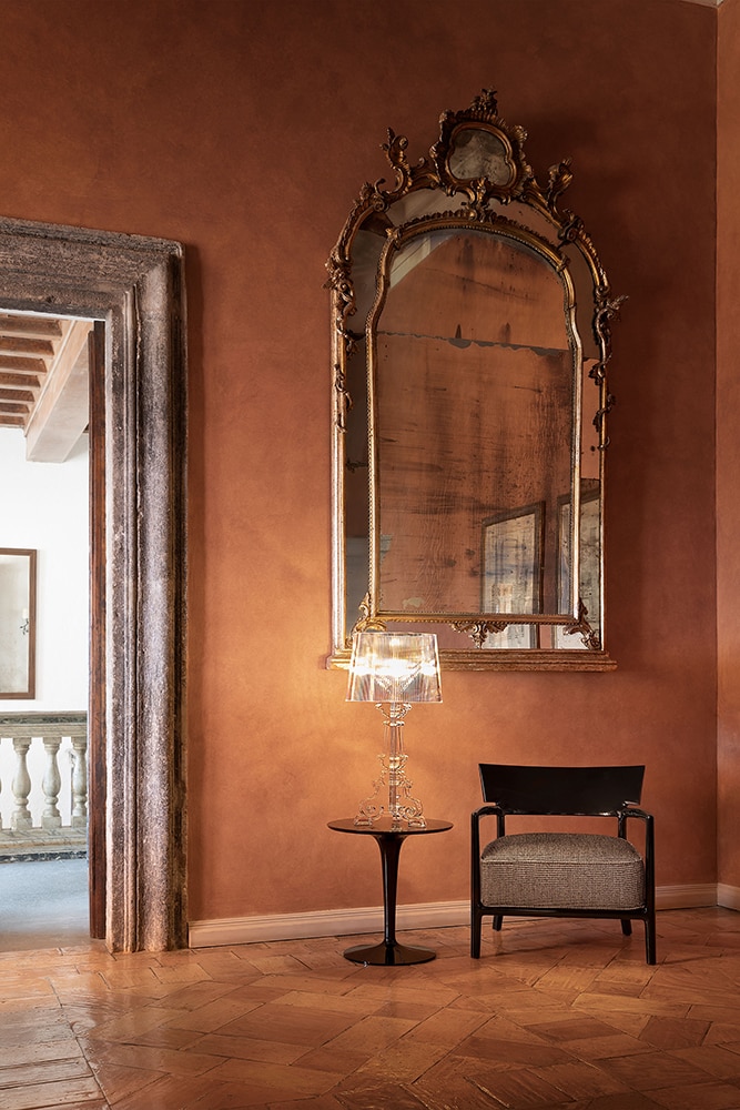 Bourgie unites classicism, wealth and tradition with technological innovation. The baroque-style base consists of three decorated elements that interlock, while the large shade is created with a pleated effect which creates a multitude of reflections when