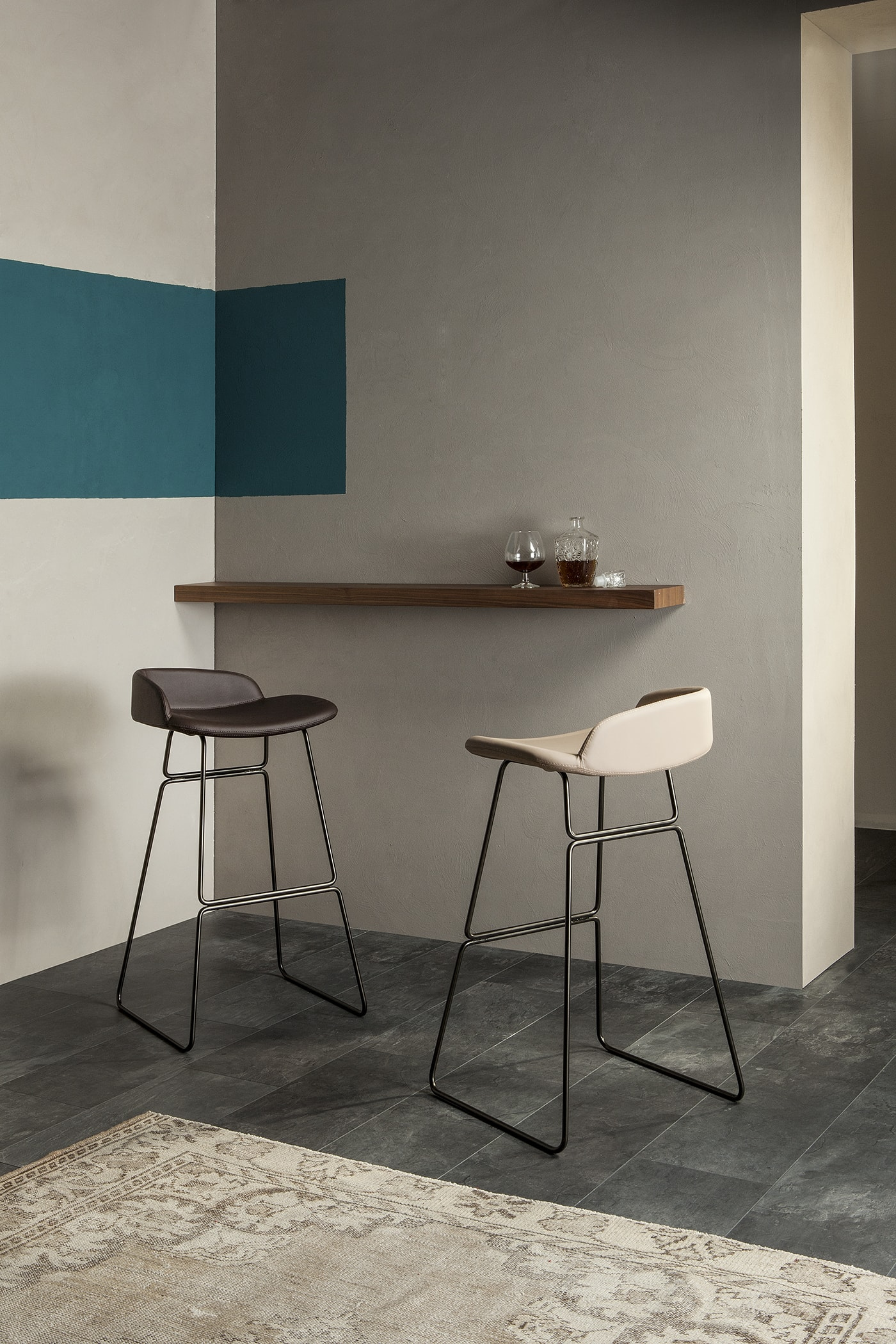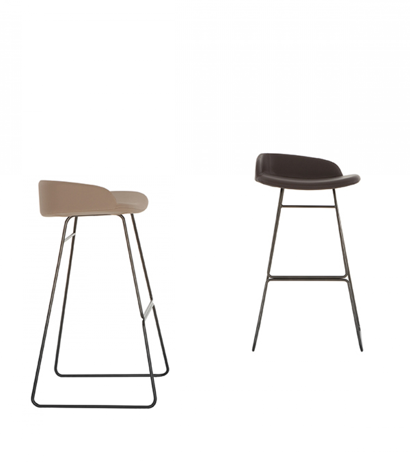Brend is a stool with a structure thought to break the classic tubular metal legs. The footrest sharply splits the inferior part of the structure, from the upper one. Doing so, it creates a shape that combines three different elements: a base, a structure, and a covered seat designed to be low and minimalistic – which allows it to complete the stool perfectly.