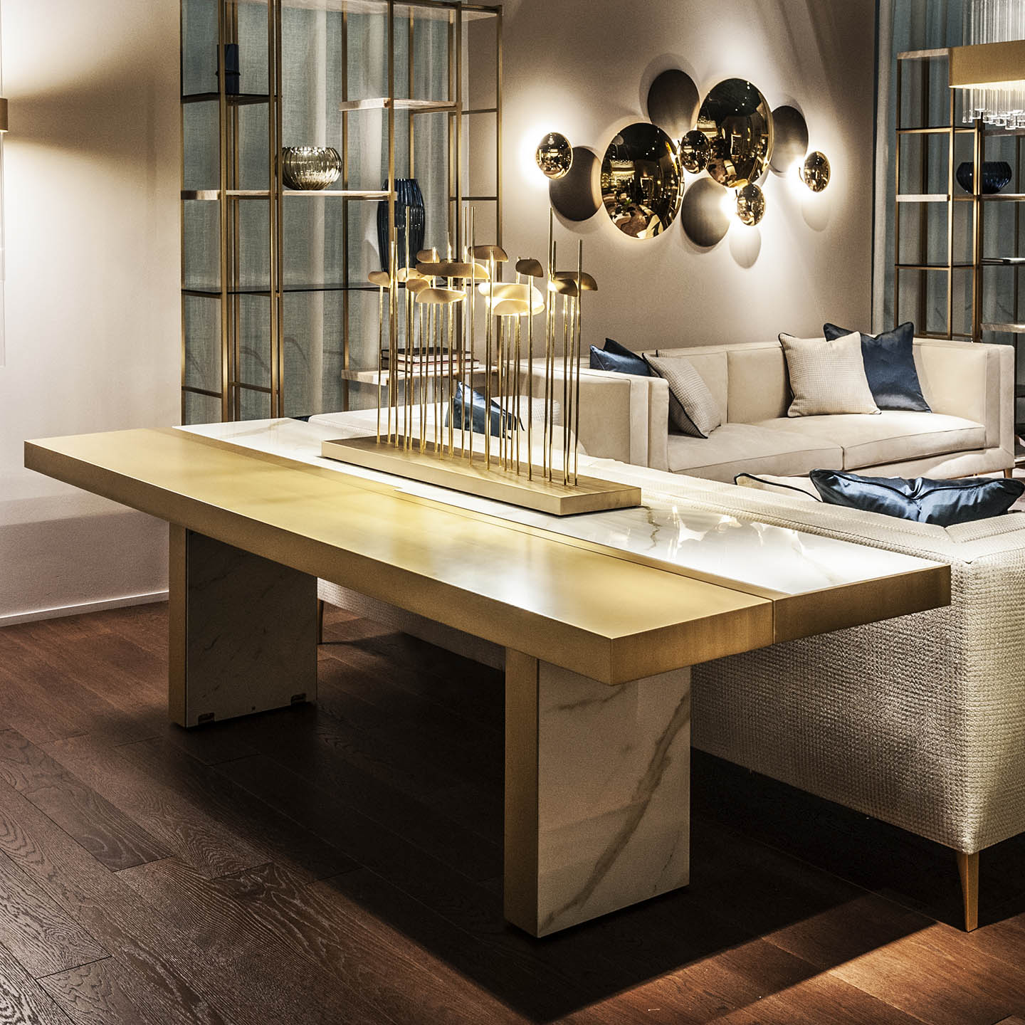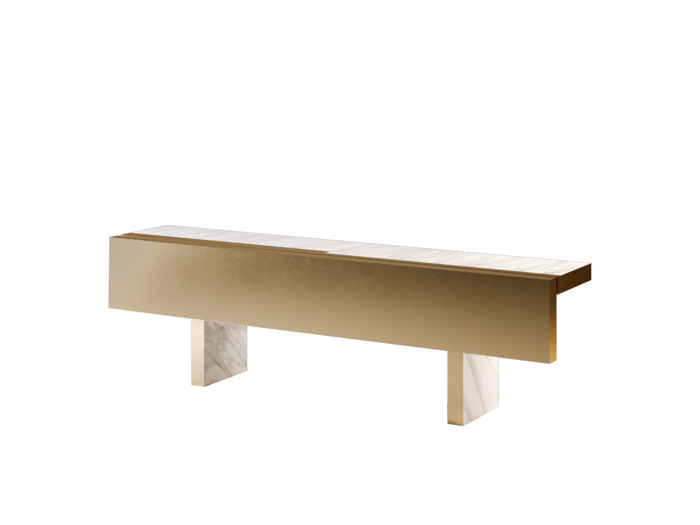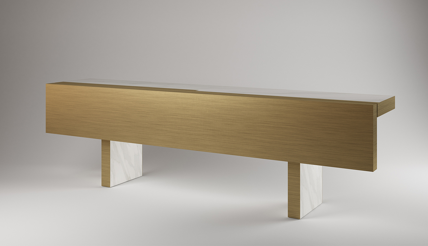 Console table with a clean and geometric design, easily transforms into a dining table. The structure is in metal and is composed of vertical uprights that support the ceramic top with “Calacatta marble” effect, with MDF mat gold-painted insert.Flap with structure in painted brass bronze-colored MDF. The thickness of the top is 80 mm, with edge covered in metal with mat gold finish.Lifting system to allow the exit of the wheels that allows the movement.
