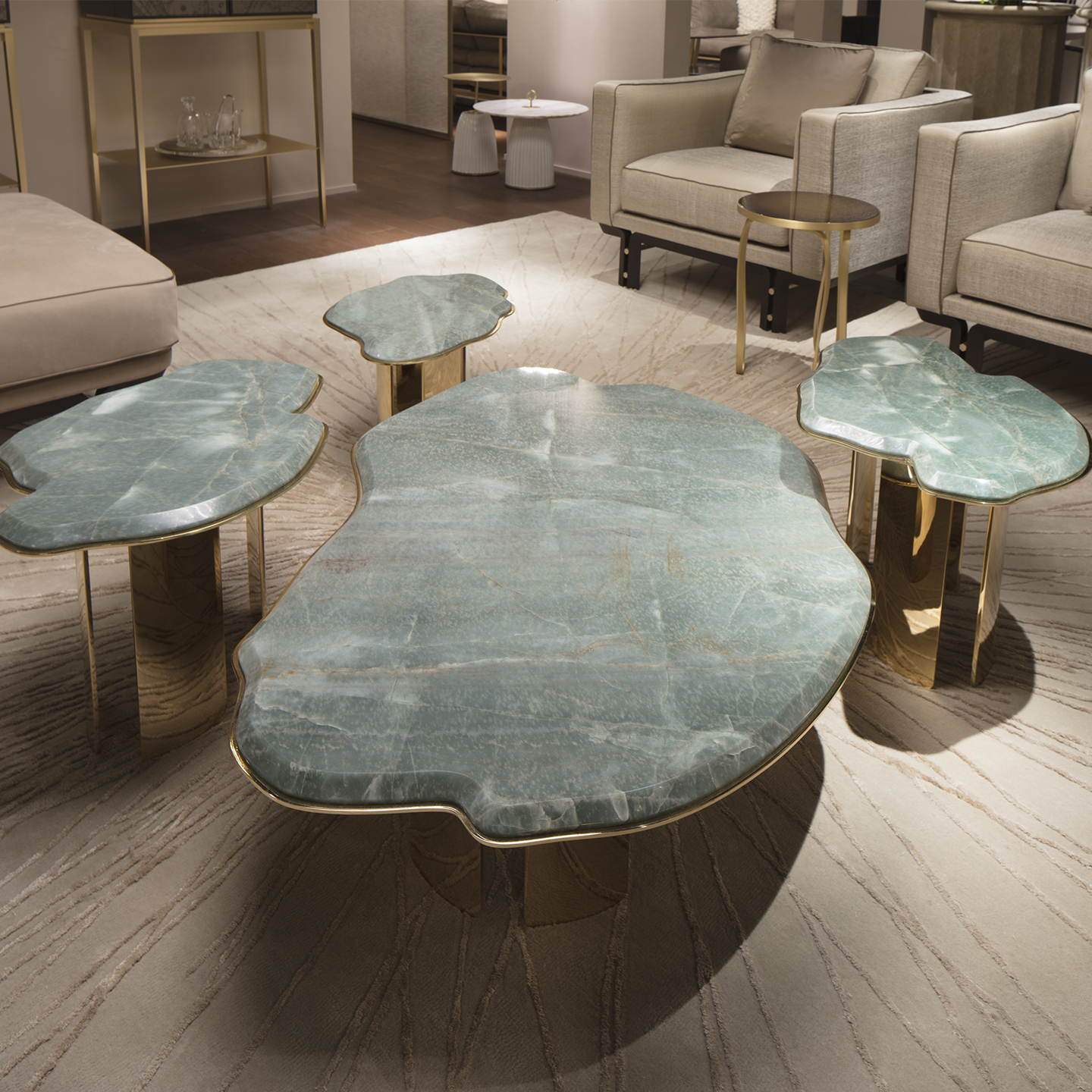 The inspiration comes from the famous “water-lilies” paintings of the impressionist artist Claude Monet. This gave birth to the series of serving elements consisting of three variants to be used as trivets in various situations. Softness and rigidity, matching of contrasting materials. These are the details that create imperceptible movements in the progression of the forms.The metal bases in shiny gold galvanic finish support mutating glimpses of lake in botanic green marble which lightly taper off in the lower part, smoothing their geometry; soft forms, highly calibrated, painstaking details.