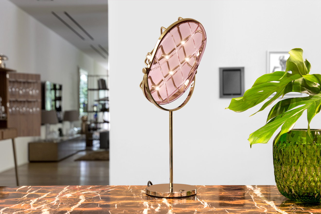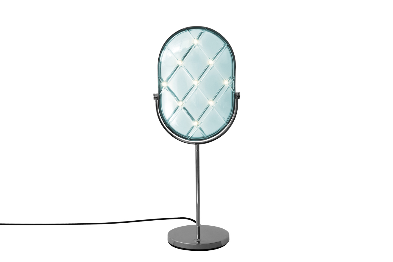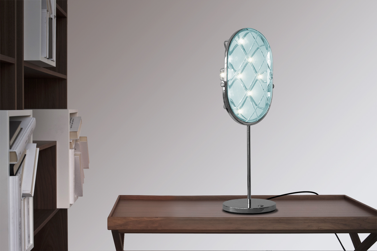 Crystal is a table lamp which brings the beauty of the glass to its highest level, underlining the illuminating properties of this classic, sublime, iconic material.Just like any reflecting object, Crystal reflects as well as a mirror, a mask, a memory of a forgotten distant times, the beauty of the future.