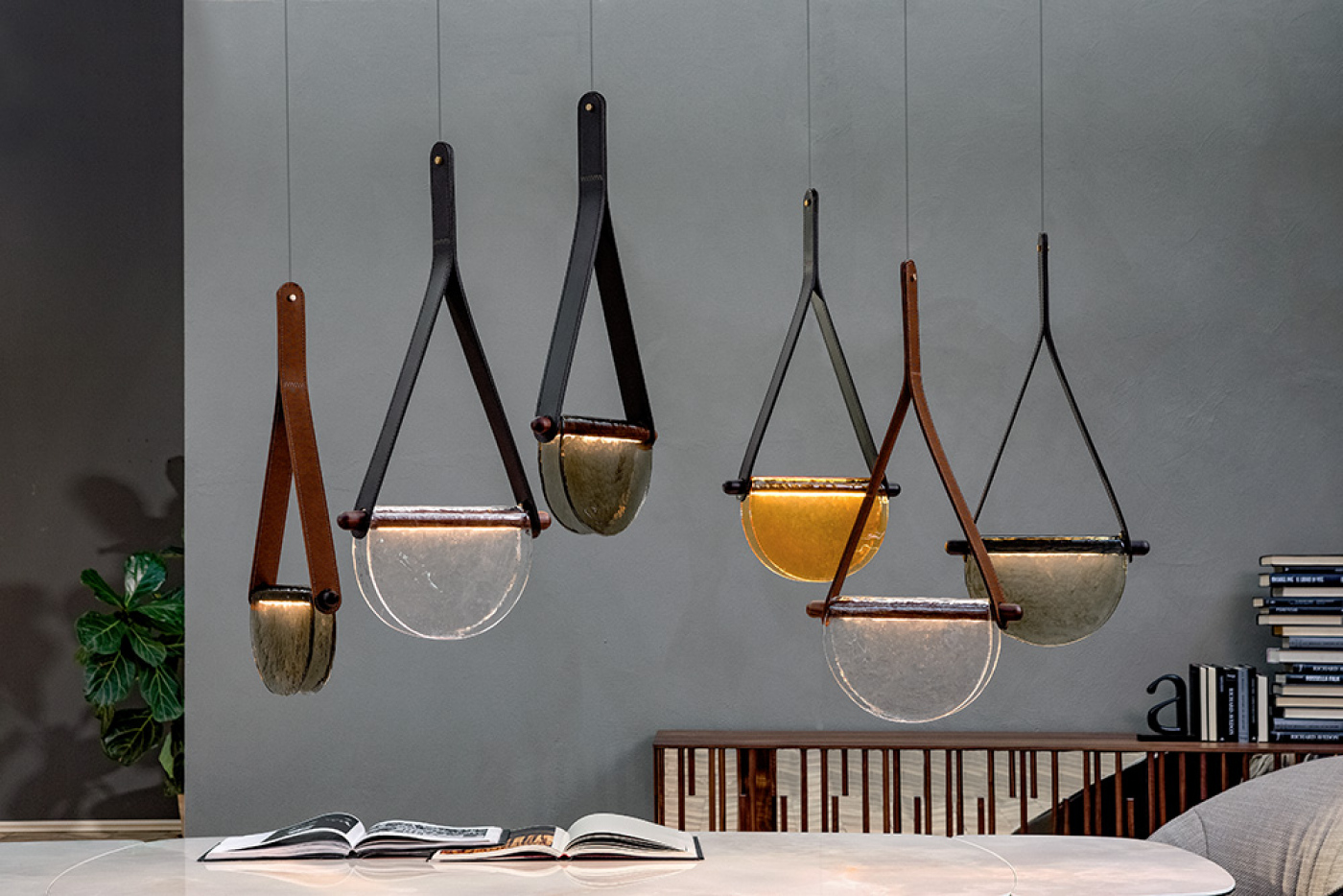 Like the watches by the great artist Dalì, the fused glass drips over solid oak wood stems with a recessed LED light. In the suspended version the extra touch is given by the real leather that supports it.