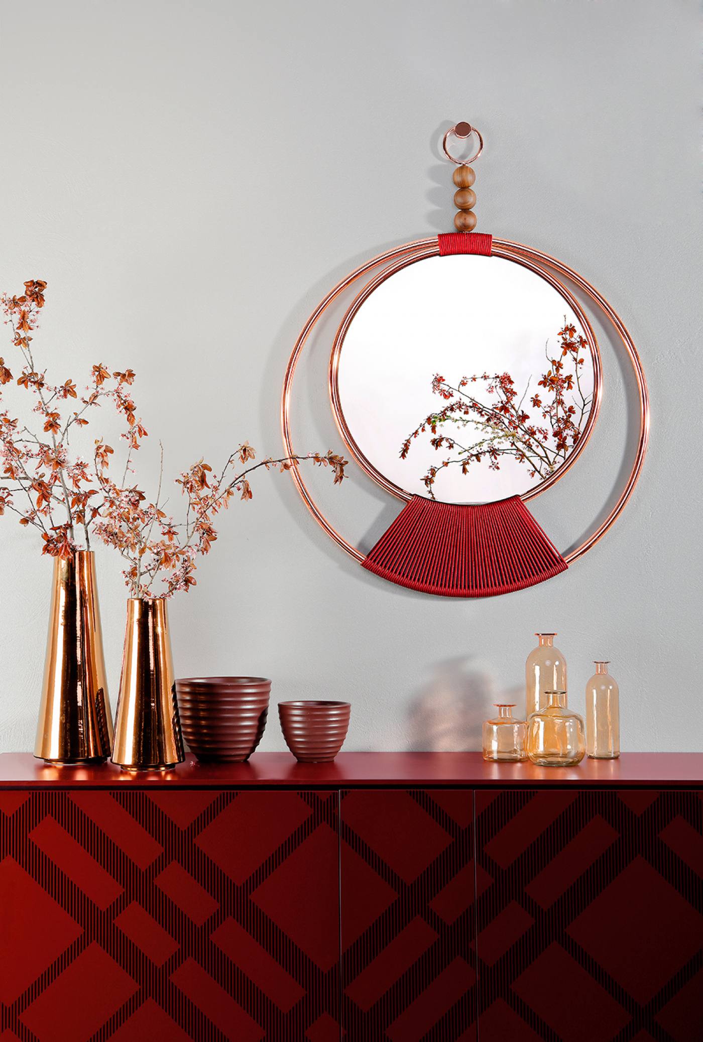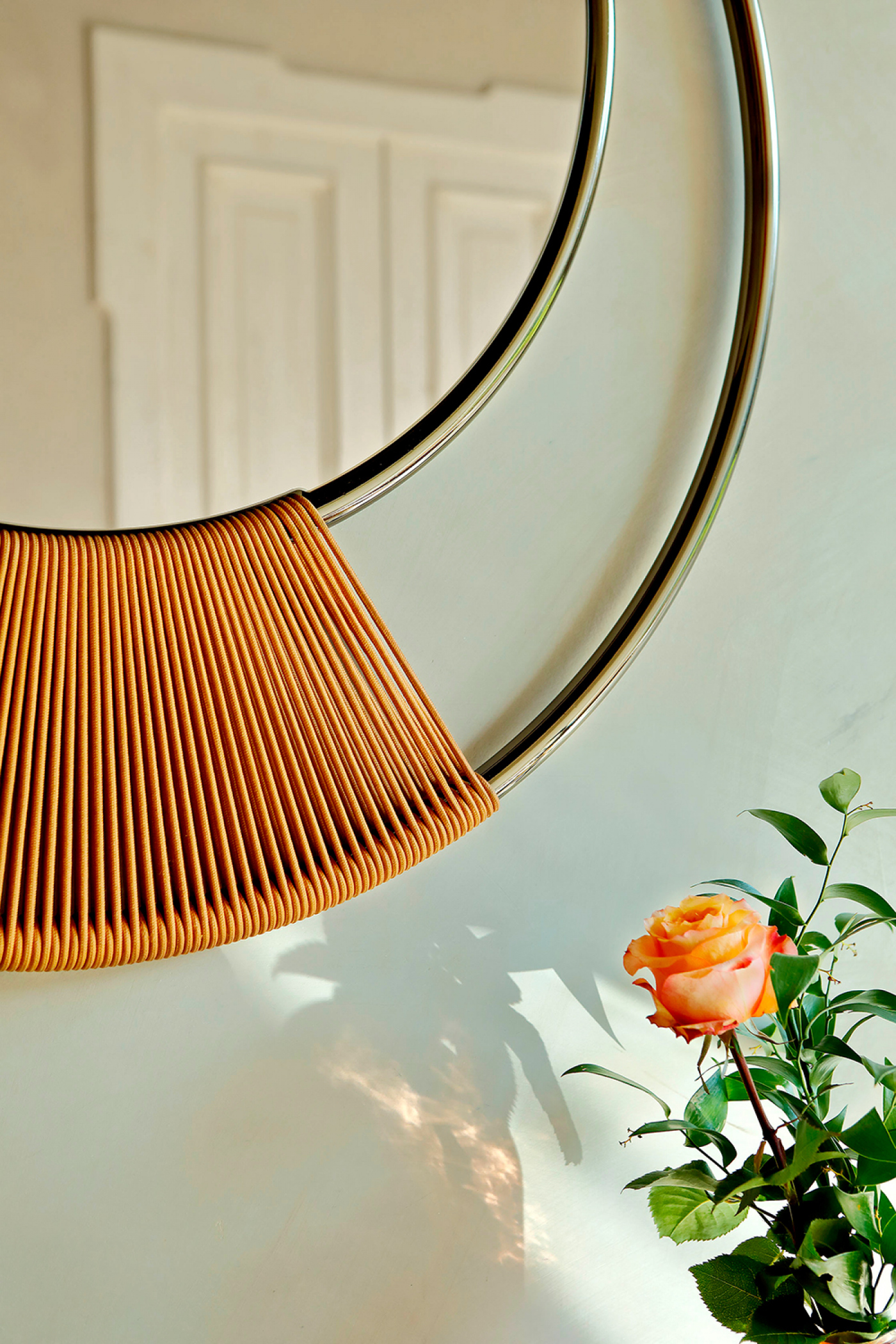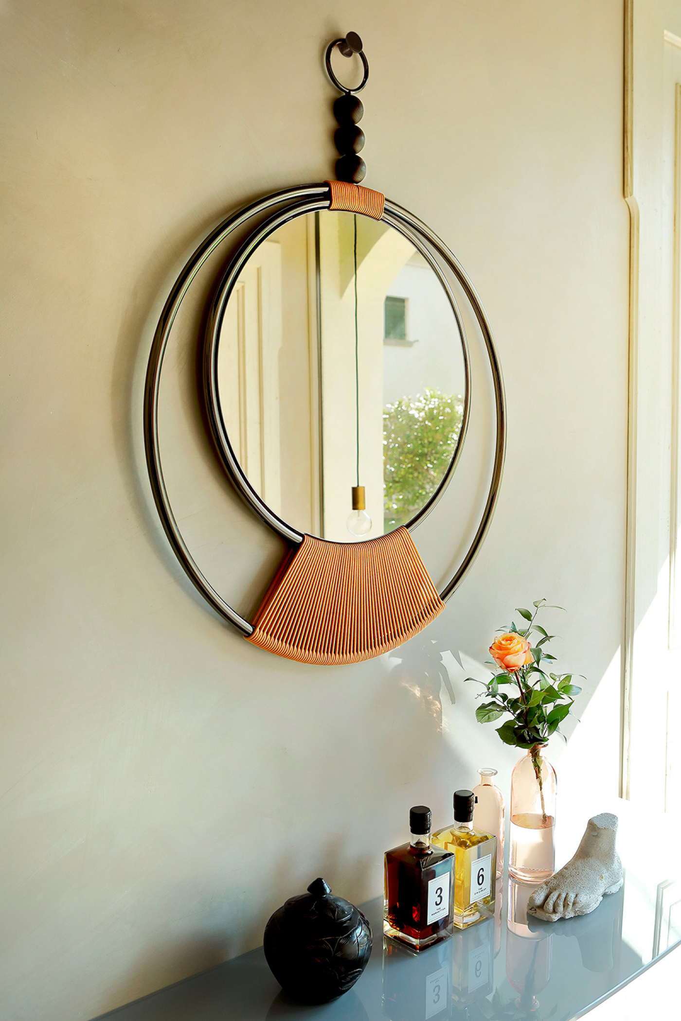 Delicate fabrics were intertwined by hand, to form a tissue capable of supporting the bronze, or grey mirror. A chromed metal structure, a circle protecting the mirror, forms a light and quiet shape, that is completed by three solid wood elements. A pendant, to make every wall unforgettable.