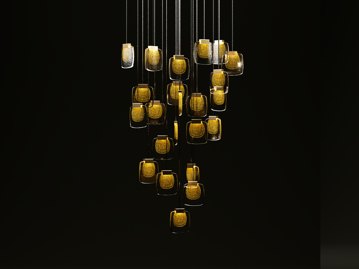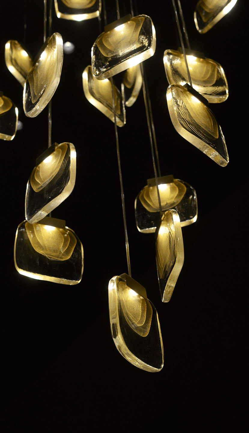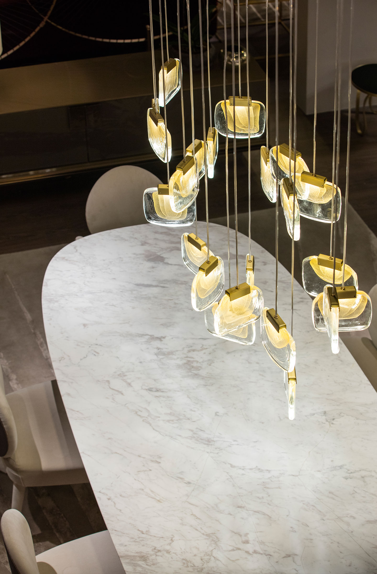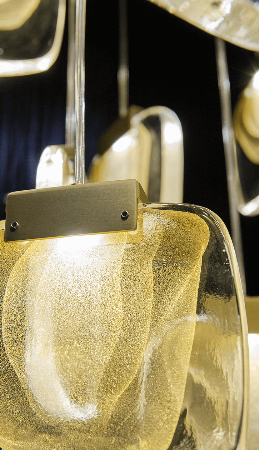 A refined chandelier made entirely by hand following the most ancient Murano traditions.The body of the 22 “clouds” (Oval version, with 6 built-in spotlights) and 23 “clouds” (Round version, with 5 built-in spotlights), arranged at staggered heights, is made of Murano glass with a triple pass of gold leaf and is formed by hand in a shaped mould.The glass “cloud” is attached to a metal body with a satin gold finish and houses a modern LED fitting. The metal body is anchored onto a steel plate, painted in white or black.Available in two versions: Oval and Round.