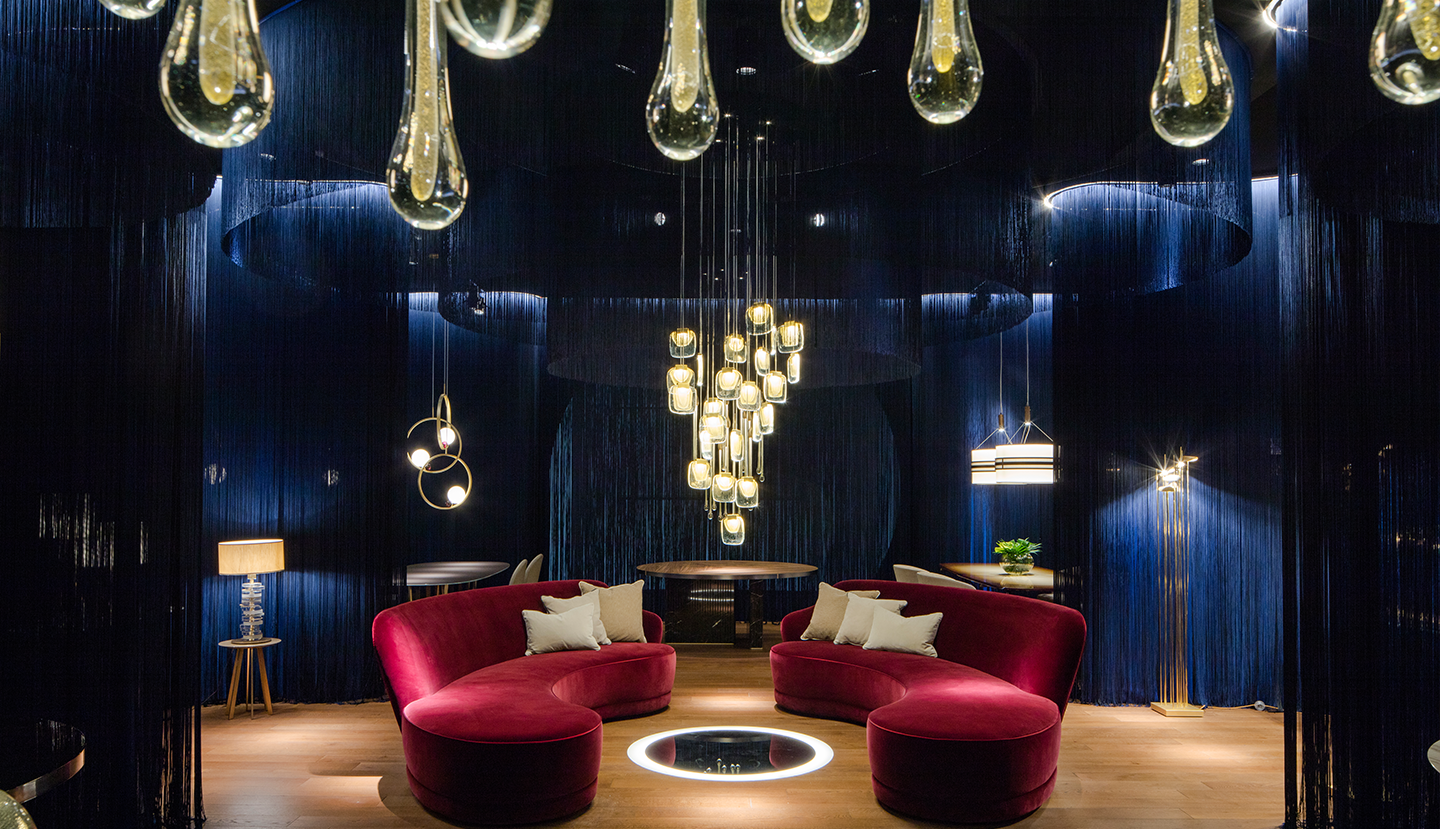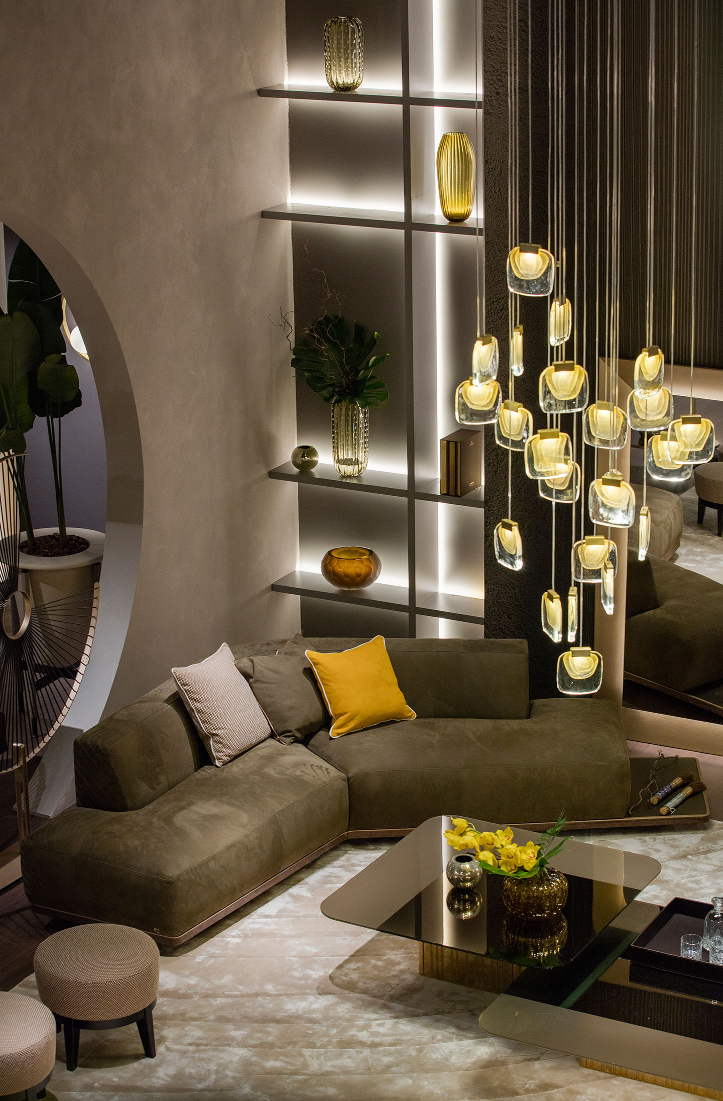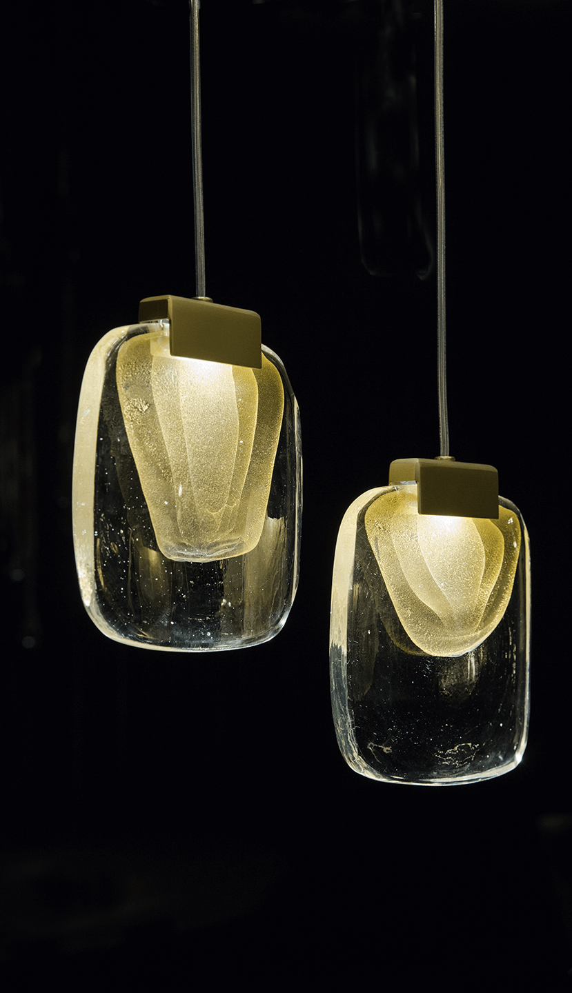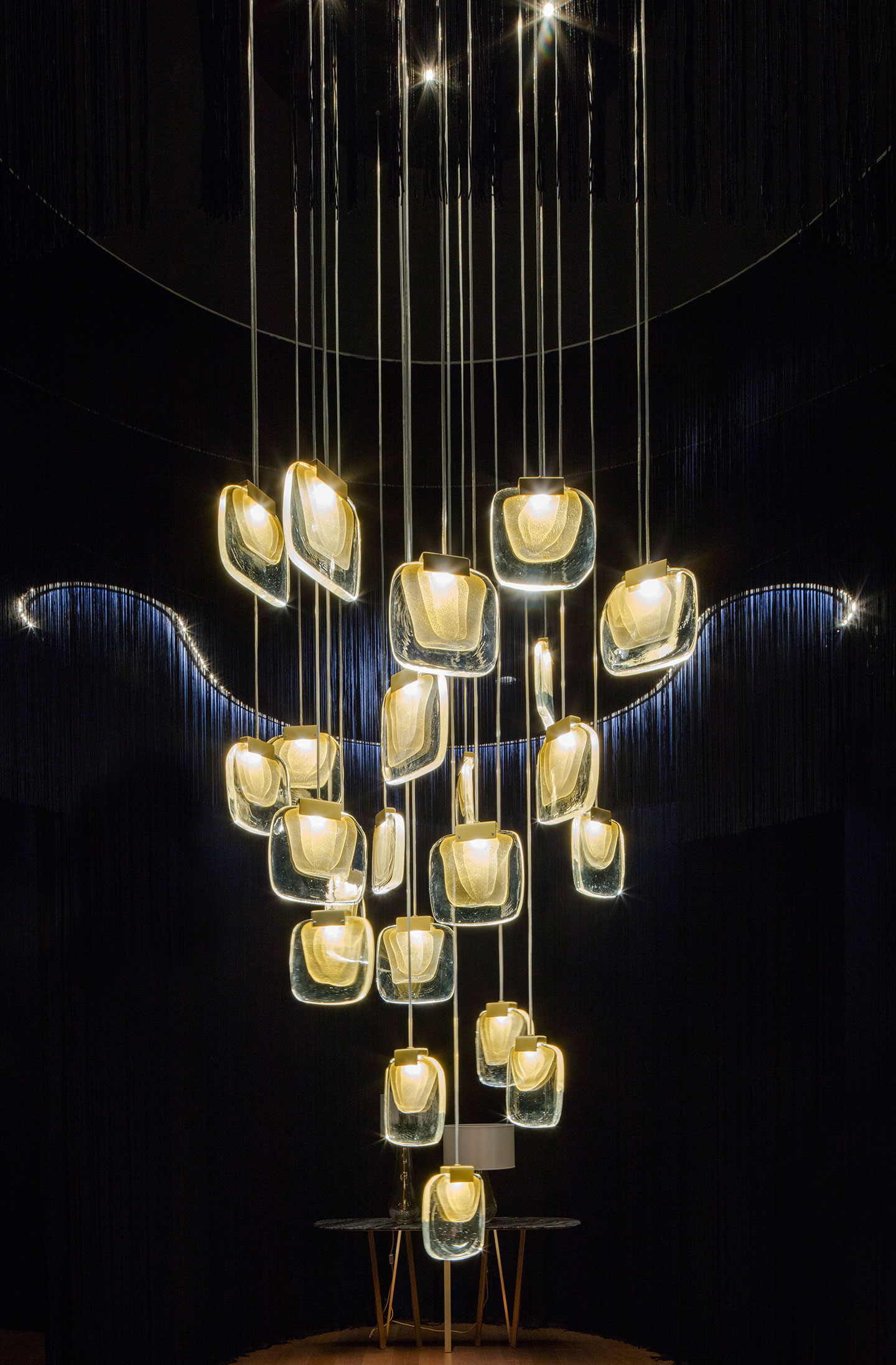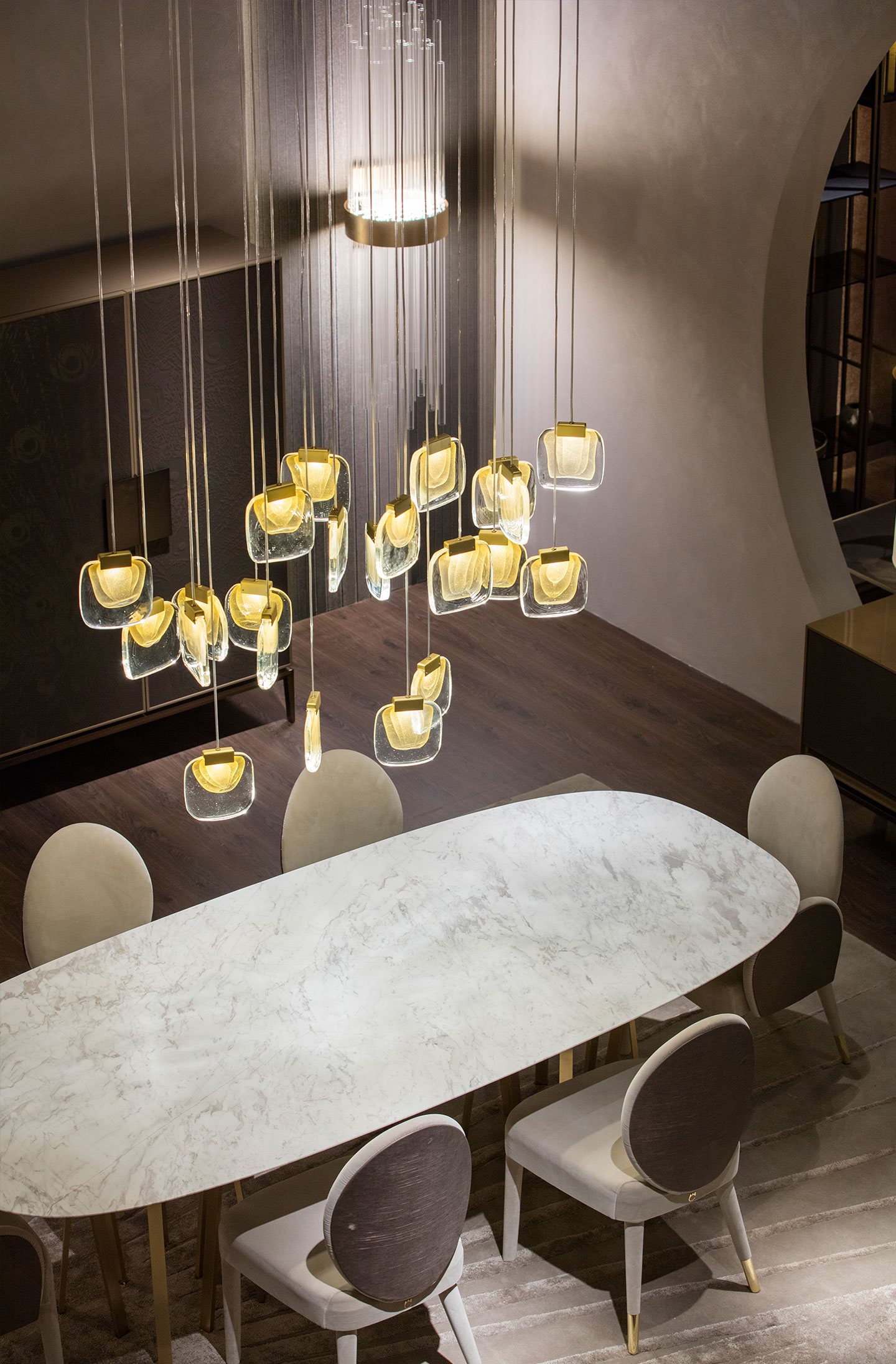 A refined chandelier made entirely by hand following the most ancient Murano traditions.The body of the 22 “clouds” (Oval version, with 6 built-in spotlights) and 23 “clouds” (Round version, with 5 built-in spotlights), arranged at staggered heights, is made of Murano glass with a triple pass of gold leaf and is formed by hand in a shaped mould.The glass “cloud” is attached to a metal body with a satin gold finish and houses a modern LED fitting. The metal body is anchored onto a steel plate, painted in white or black.Available in two versions: Oval and Round.