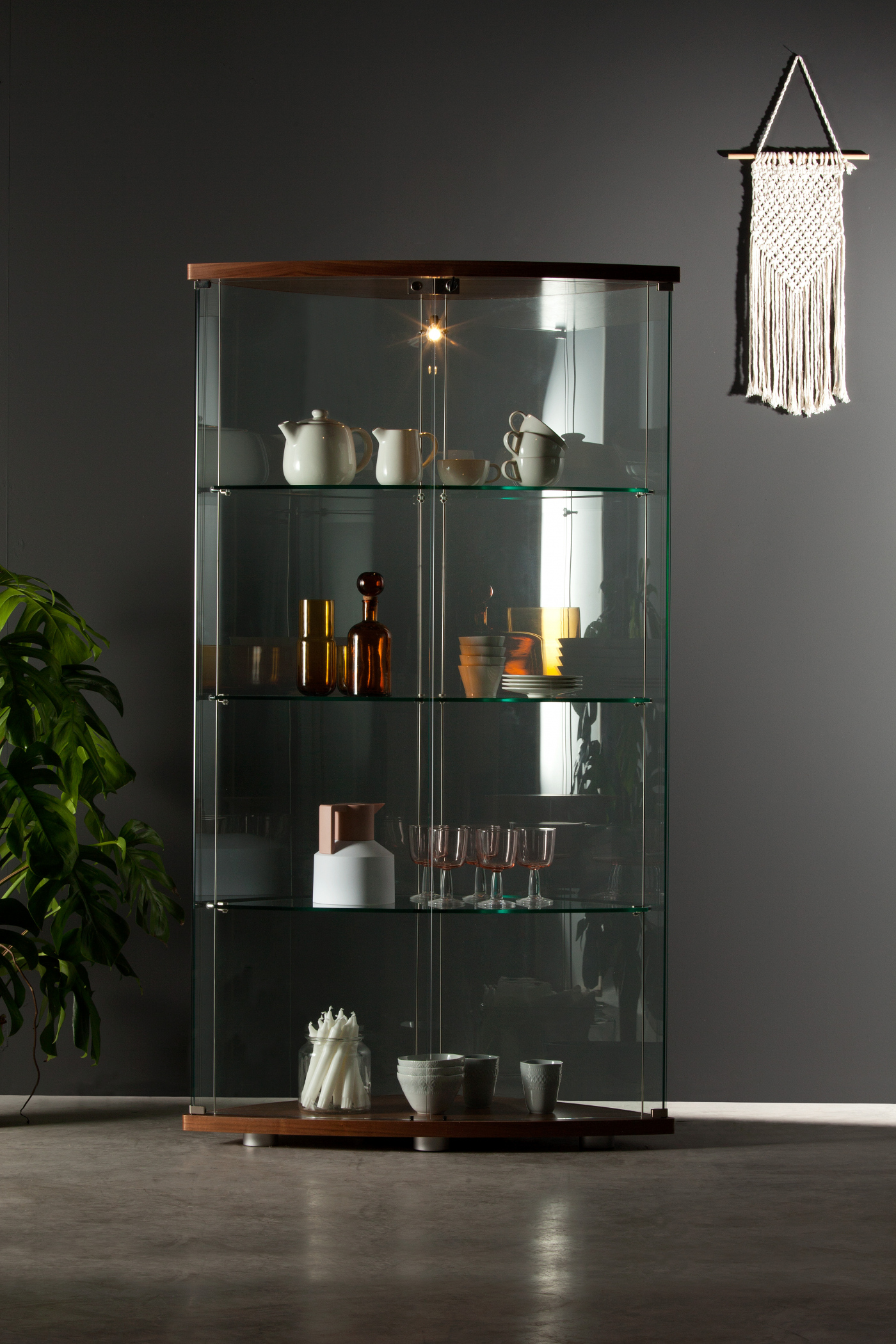 Gracia's shape is simple and soft, formed by a curve thought to glorify what stays on the inside. Wood holds and thickens the base and the top, while curved glass softly follows the lines made by the nack and the doors. The built-in LED light enrichens this object even more.
