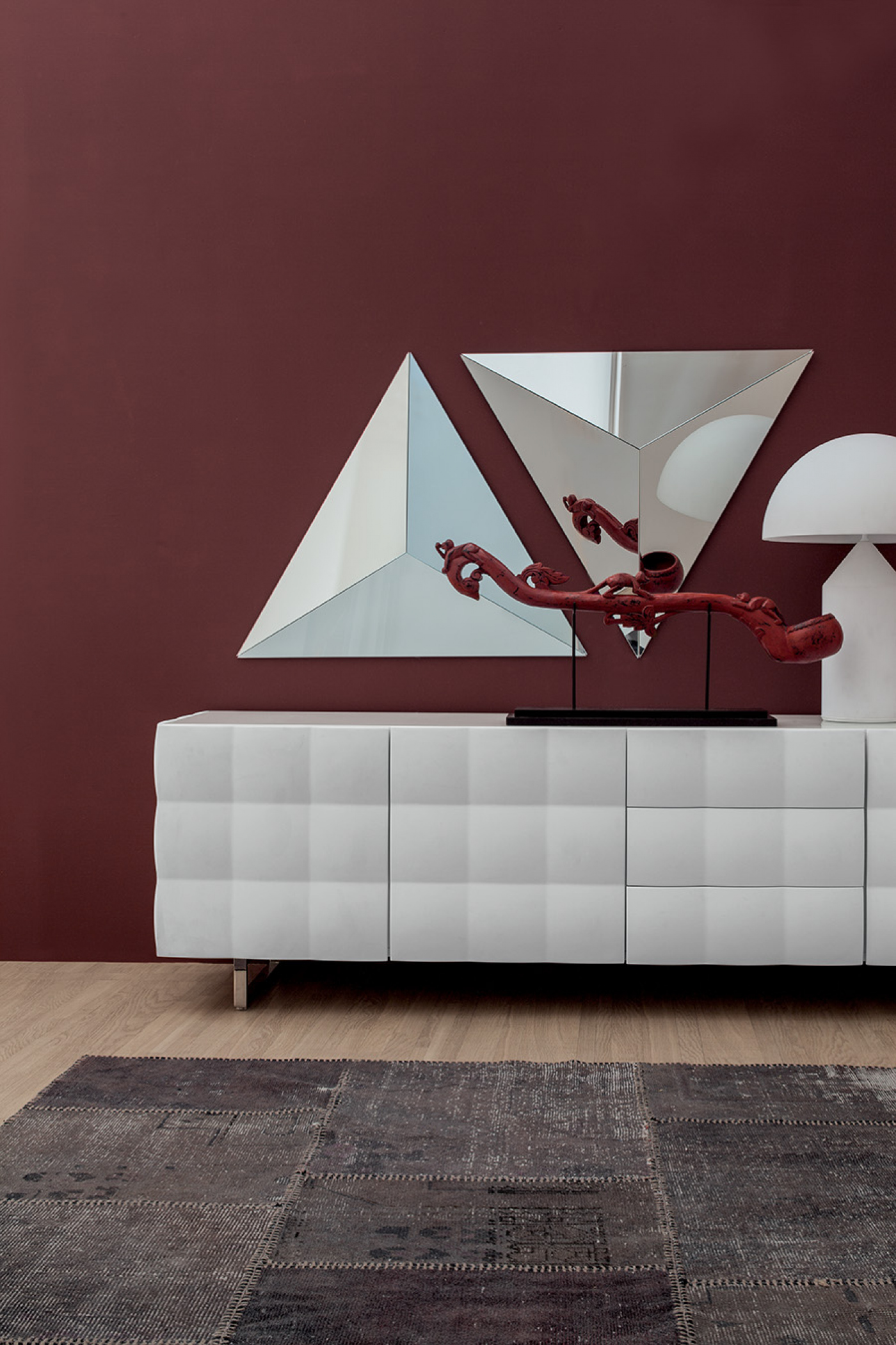 This mirror is technically referred to as “skewed”, but it definitely is much more than this: its peculiar structure can actually duplicate the images reflected on it, and hence magnify the room in which it is hung. Only the silver mirror version is available, precisely to enhance its tridimensional shape, and to better refract light.