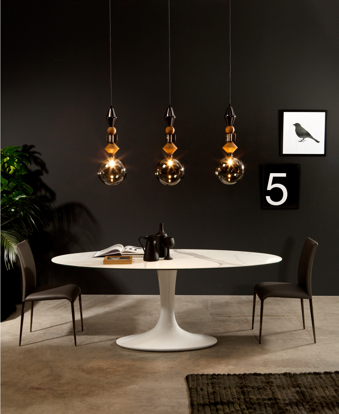 Imperial table grows like an oval-based stem: it thickens on the ground, and gets thinner as it goes up, shaping a perfect balance between empty spaces and material. The shiny cultured marble - the base - marries different finishes of tempered glass and porcelain stoneware - the top.
