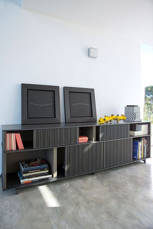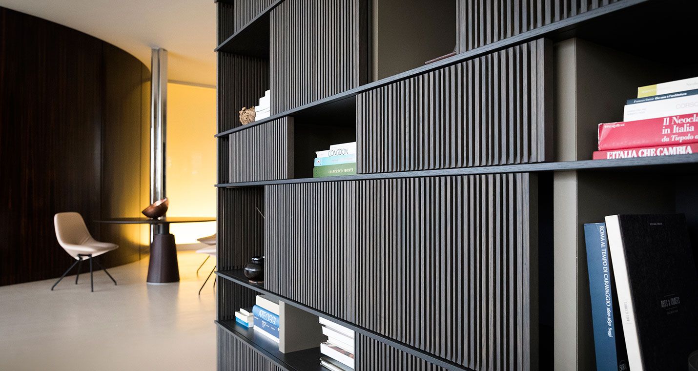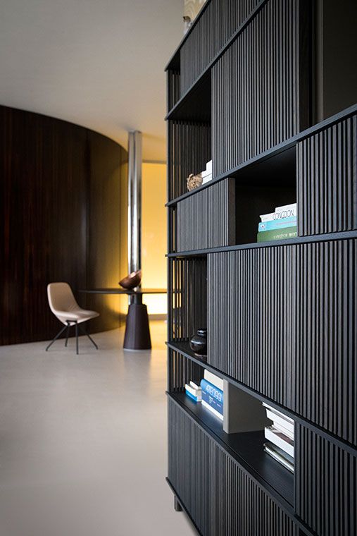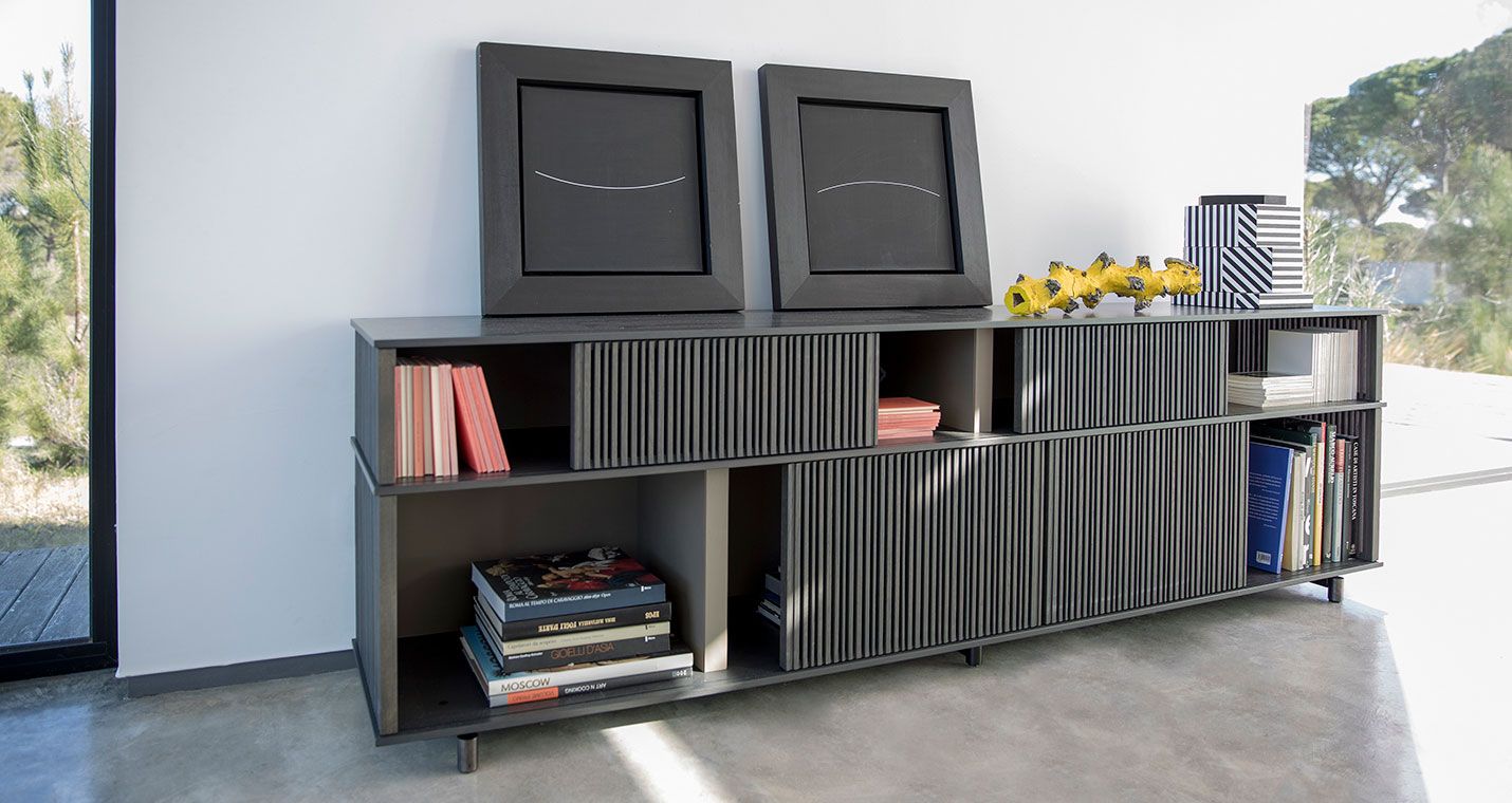 With the Lloyd storage units and bookcases Jean-Marie Massaud designs a system of variable geometries. Thin vertical wooden rods create light grilles that run from top to bottom on invisible horizontal rails. Each grille can be moved as desired to create sequences that are different each time.