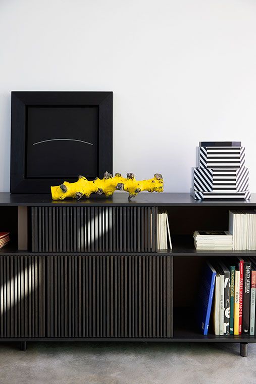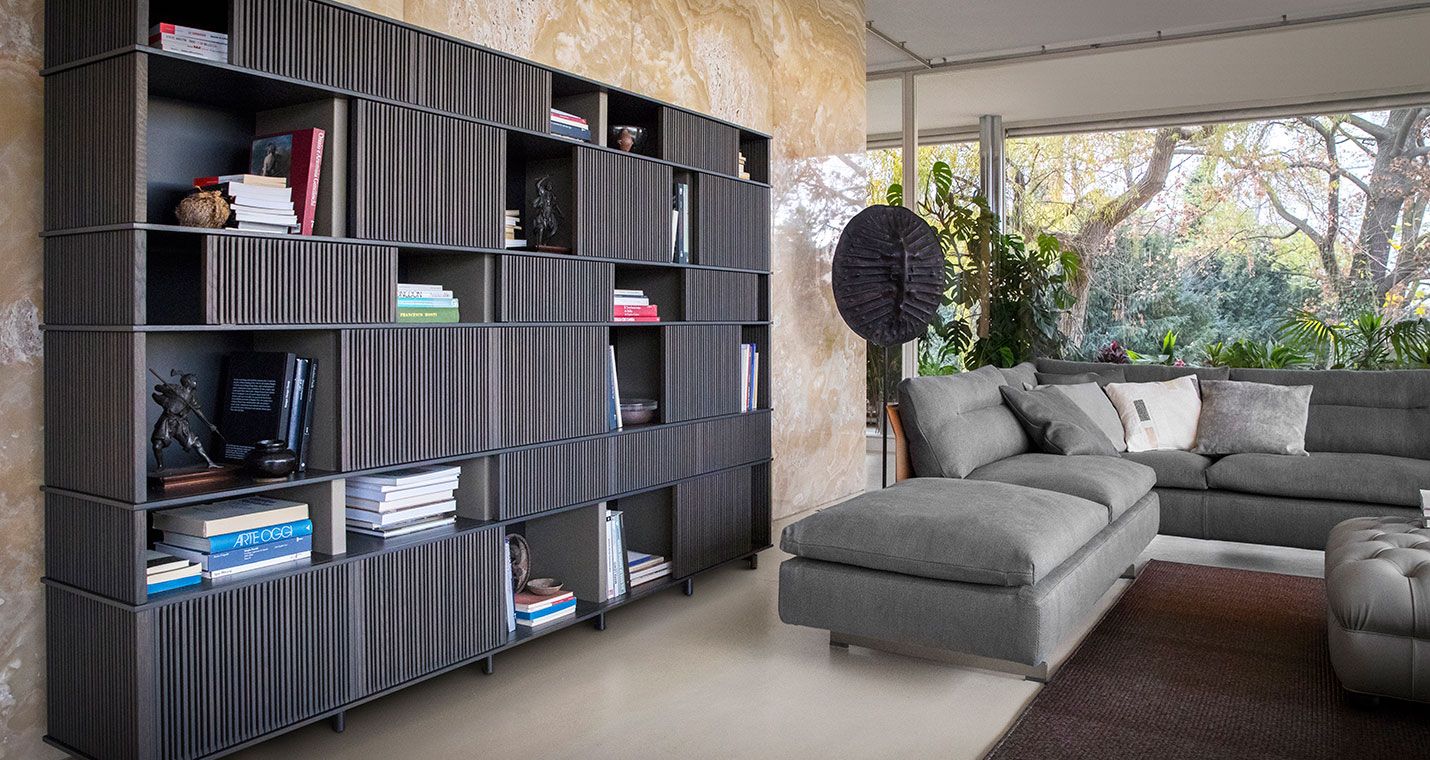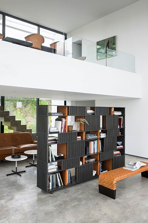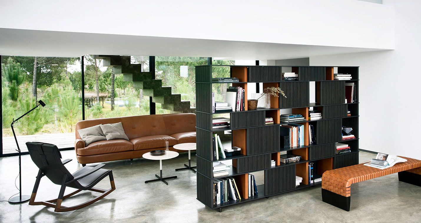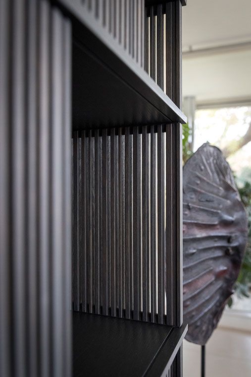 With the Lloyd storage units and bookcases Jean-Marie Massaud designs a system of variable geometries. Thin vertical wooden rods create light grilles that run from top to bottom on invisible horizontal rails. Each grille can be moved as desired to create sequences that are different each time.
