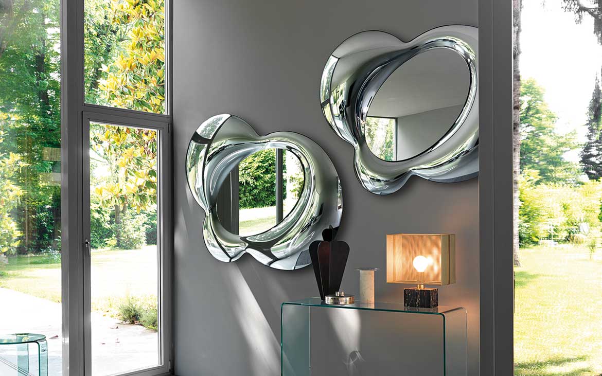 Настенное зеркало из плавленого и посеребренного стекла толщиной 8 мм; Плоское зеркало толщиной 5 мм. Задняя монтажная панель, позволяющая подвесить ее в различных положениях