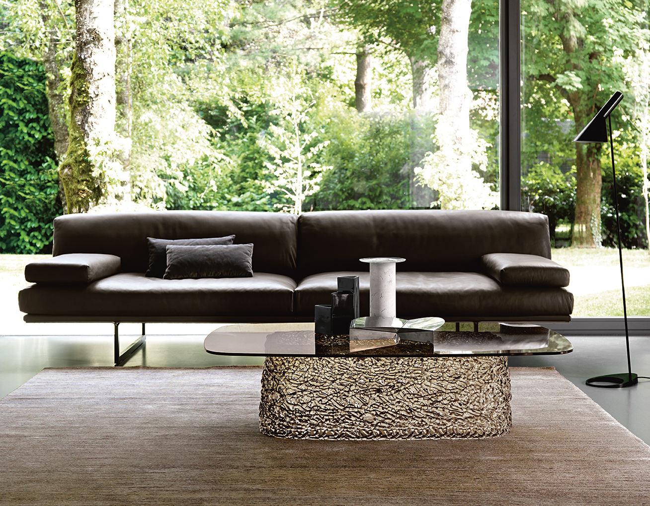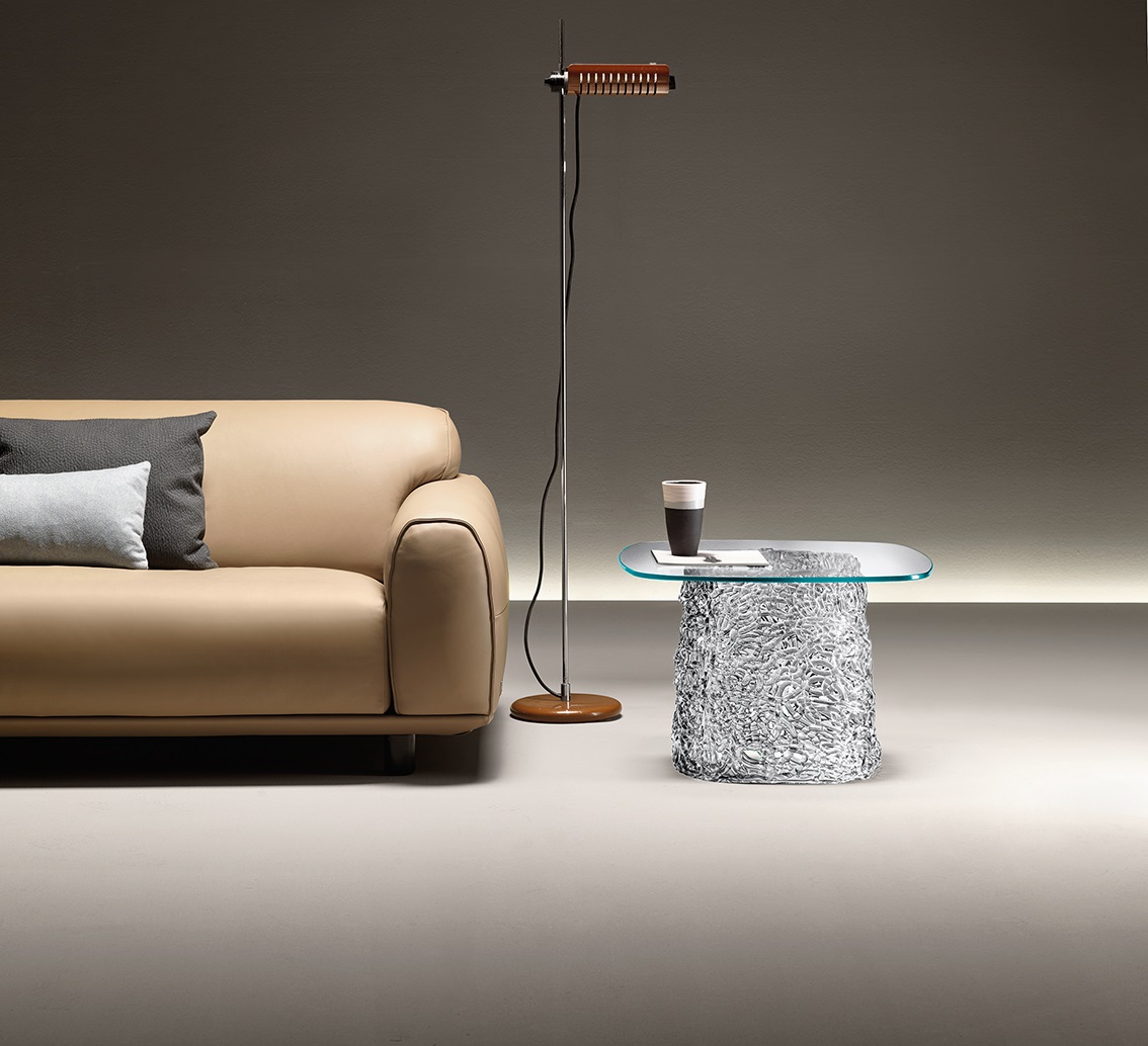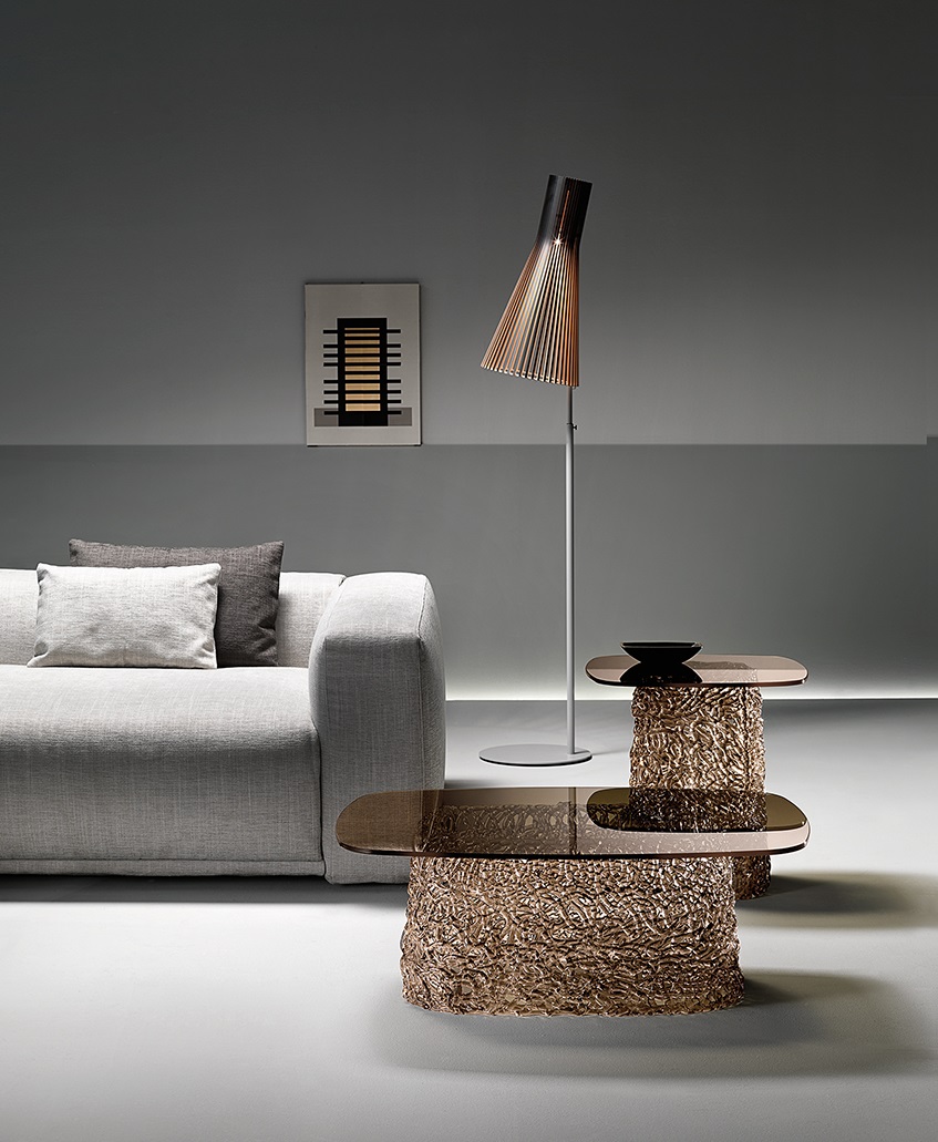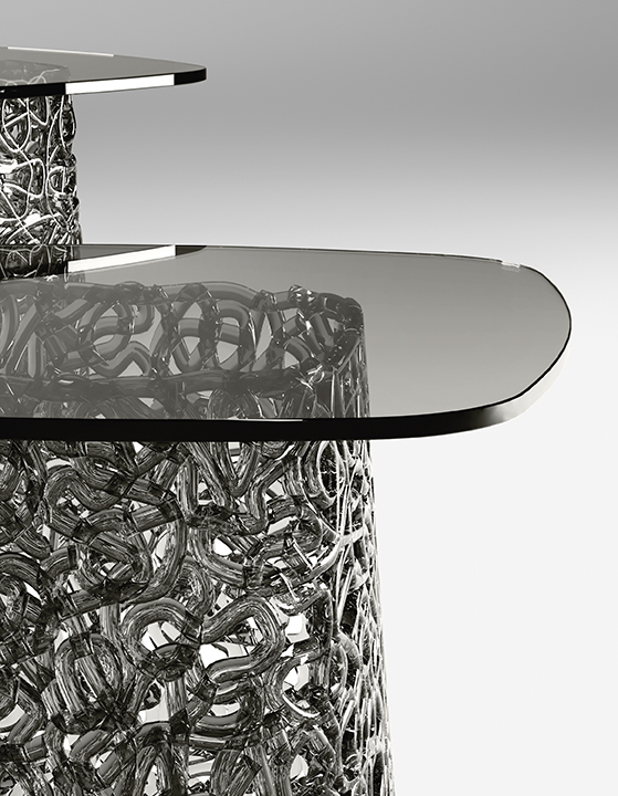 Collection of coffee tables comprising hand-interwoven spun glass base and 10 mm-thick glass top. The coffee table collection includes the following finishes: extralight glass top with extralight glass base; bronze glass top with bronze painted base; fumè grey glass top with fumè grey painted base.