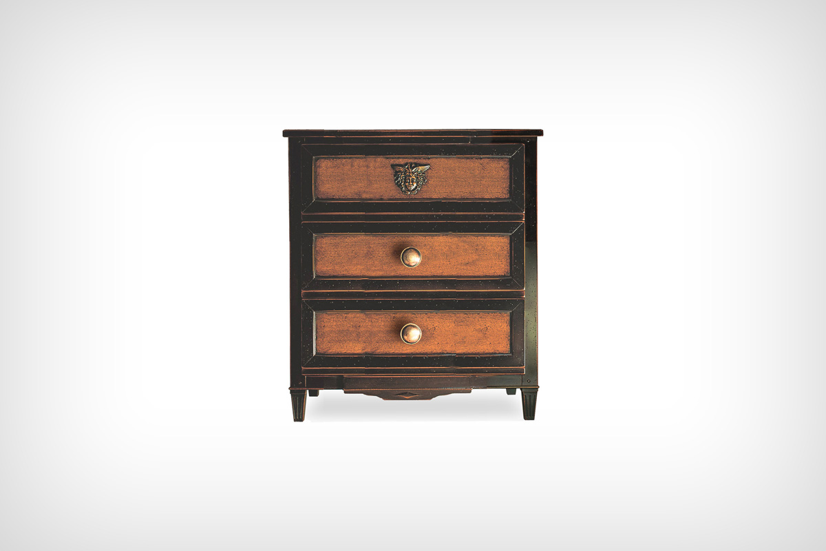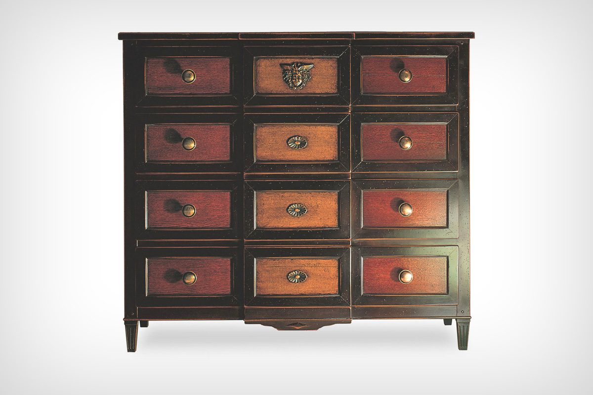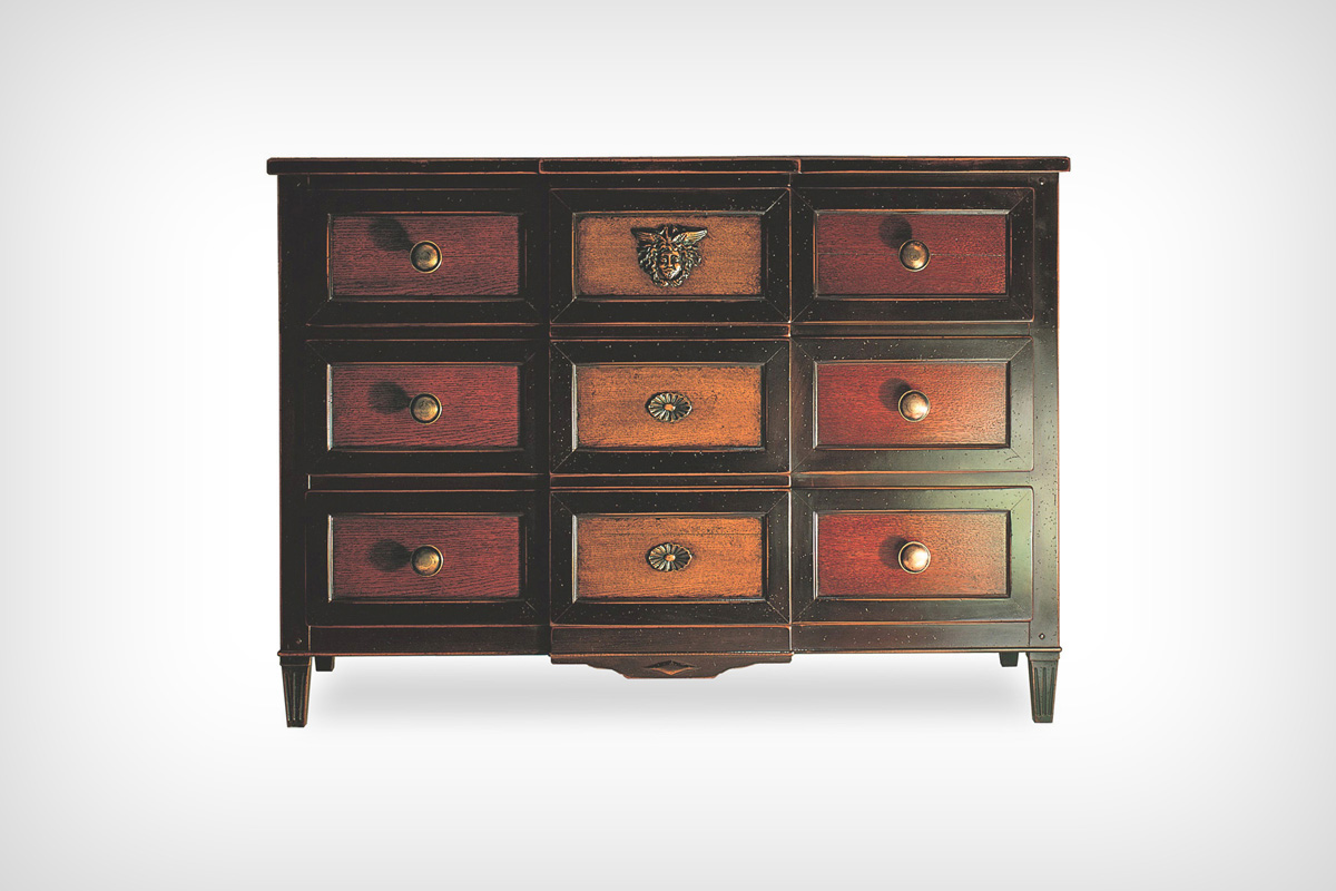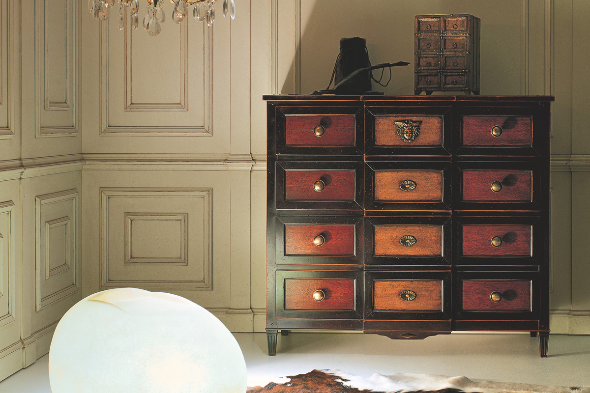 This Directoire dresser is a tribute to ‘700. The cherry frame is in chromatic contrast with the oak drawer. In the central part of the top drawer is applied a “Medusa head” wood carving.