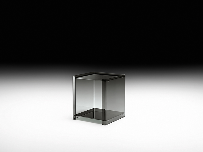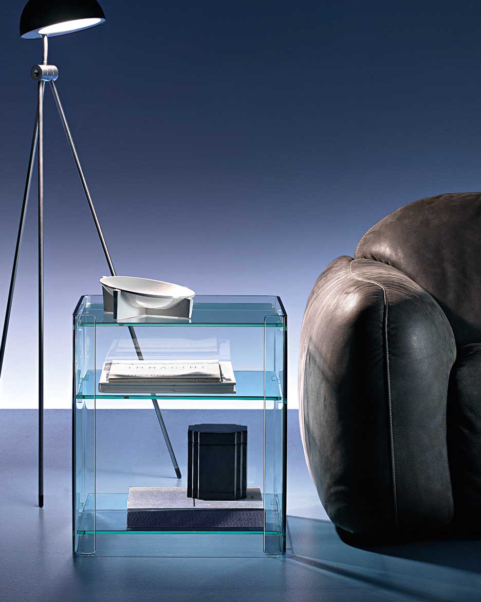 Side table in curved transparent or smoked glass, 8 mm-thick. Accessories: 8 mm-thick glass shelf in the following finishing options: transparent glass, smoked glass, black back-painted glass, extralight white back-painted glass wooden drawer black or white lacquered, with glass front back-painted respectively black or white. Glass shelves support. The side table can be fitted with 2, 3 shelves or 2 shelves and one drawer.