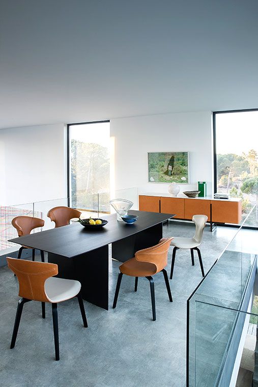 The Montera series designed by Roberto Lazzeroni has a formal lightness that expresses the sensory charm of its materials: the raw cut processing exalts the tactility of the saddle-leather and leather which, combined together, complement each other perfectly; the light stitching on the backrest forms a smile.