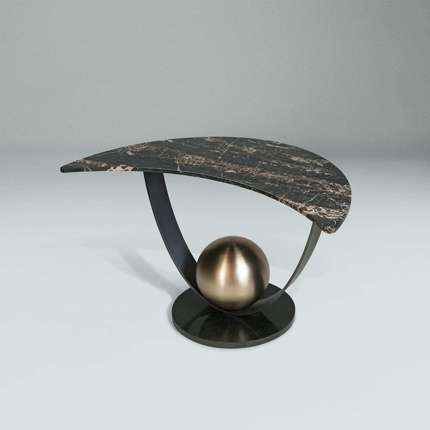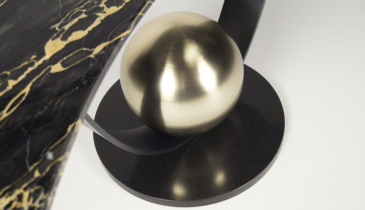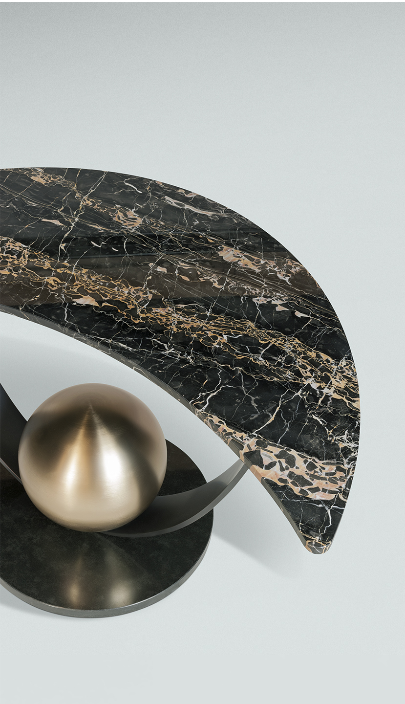 Moon Table is a totemic console in a magical and astral guise, thanks to the proportion of its curvilinear forms and the combination of metallic and natural materials.It features a base covered in black granite and a central structure made up of a curved metal strip with a matt galvanic finish, decorated with a metal sphere with a matt gold galvanic finish.The top is made of exquisite and precious italian portoro marble, featuring different coloured streaks, in the shape of a half moon, 2 cm thick.