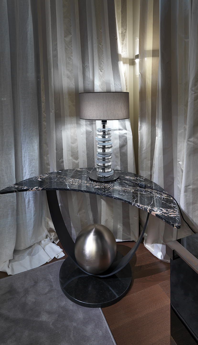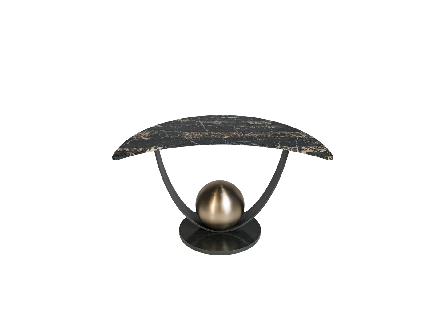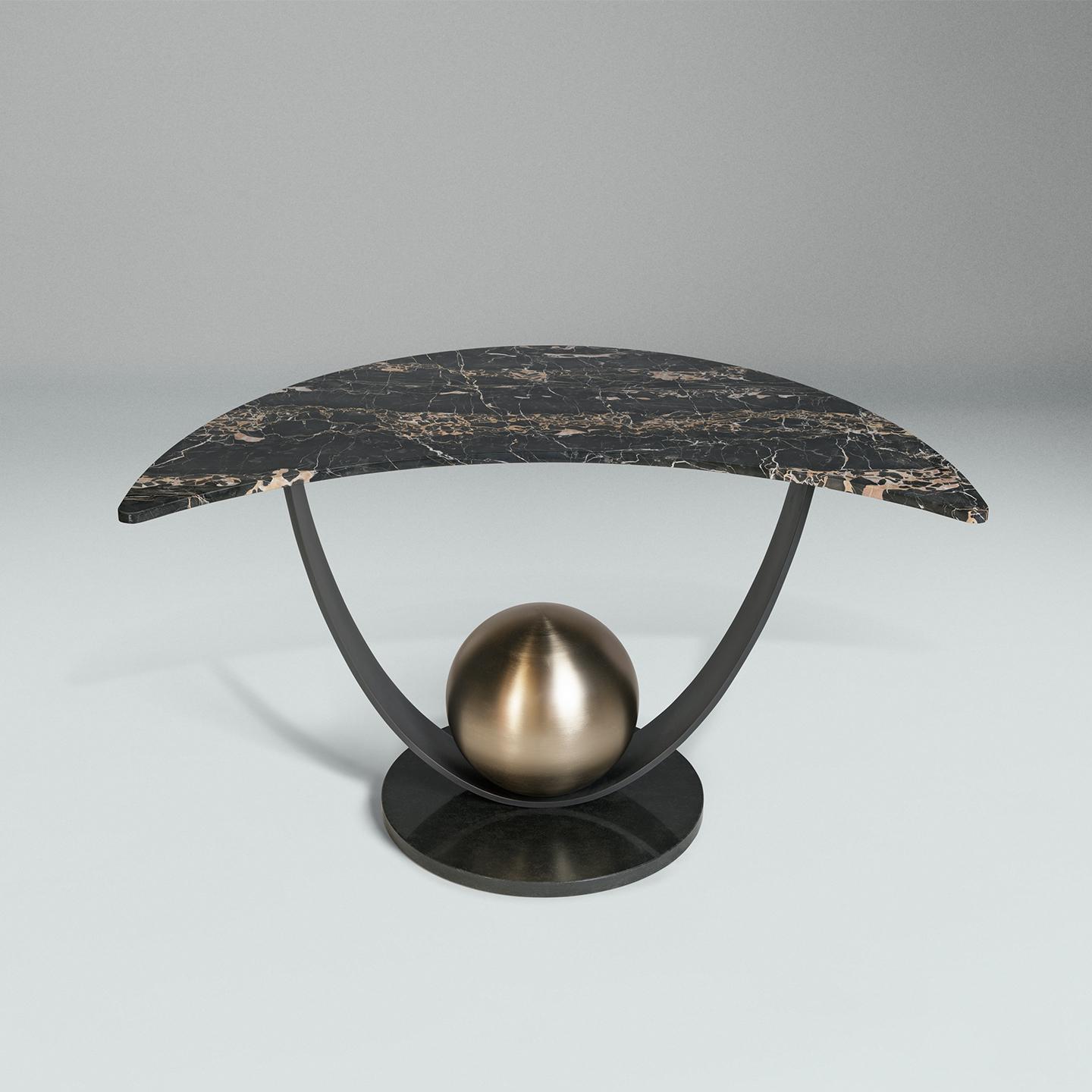 Moon Table is a totemic console in a magical and astral guise, thanks to the proportion of its curvilinear forms and the combination of metallic and natural materials.It features a base covered in black granite and a central structure made up of a curved metal strip with a matt galvanic finish, decorated with a metal sphere with a matt gold galvanic finish.The top is made of exquisite and precious italian portoro marble, featuring different coloured streaks, in the shape of a half moon, 2 cm thick.
