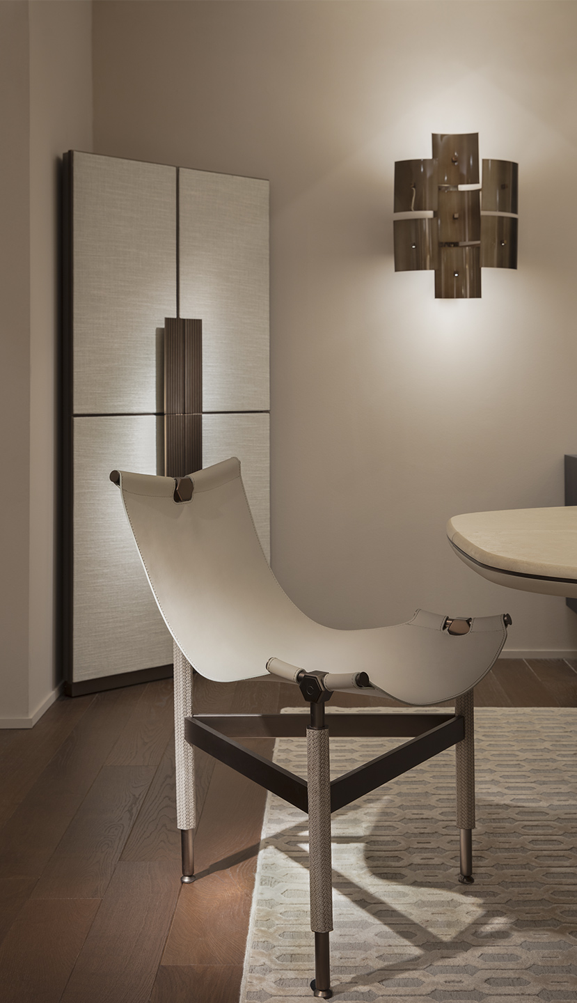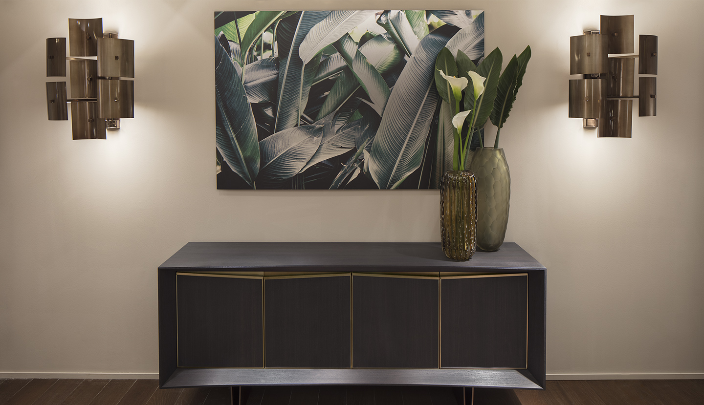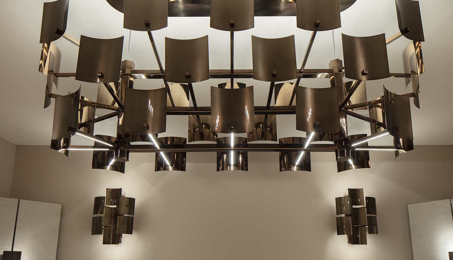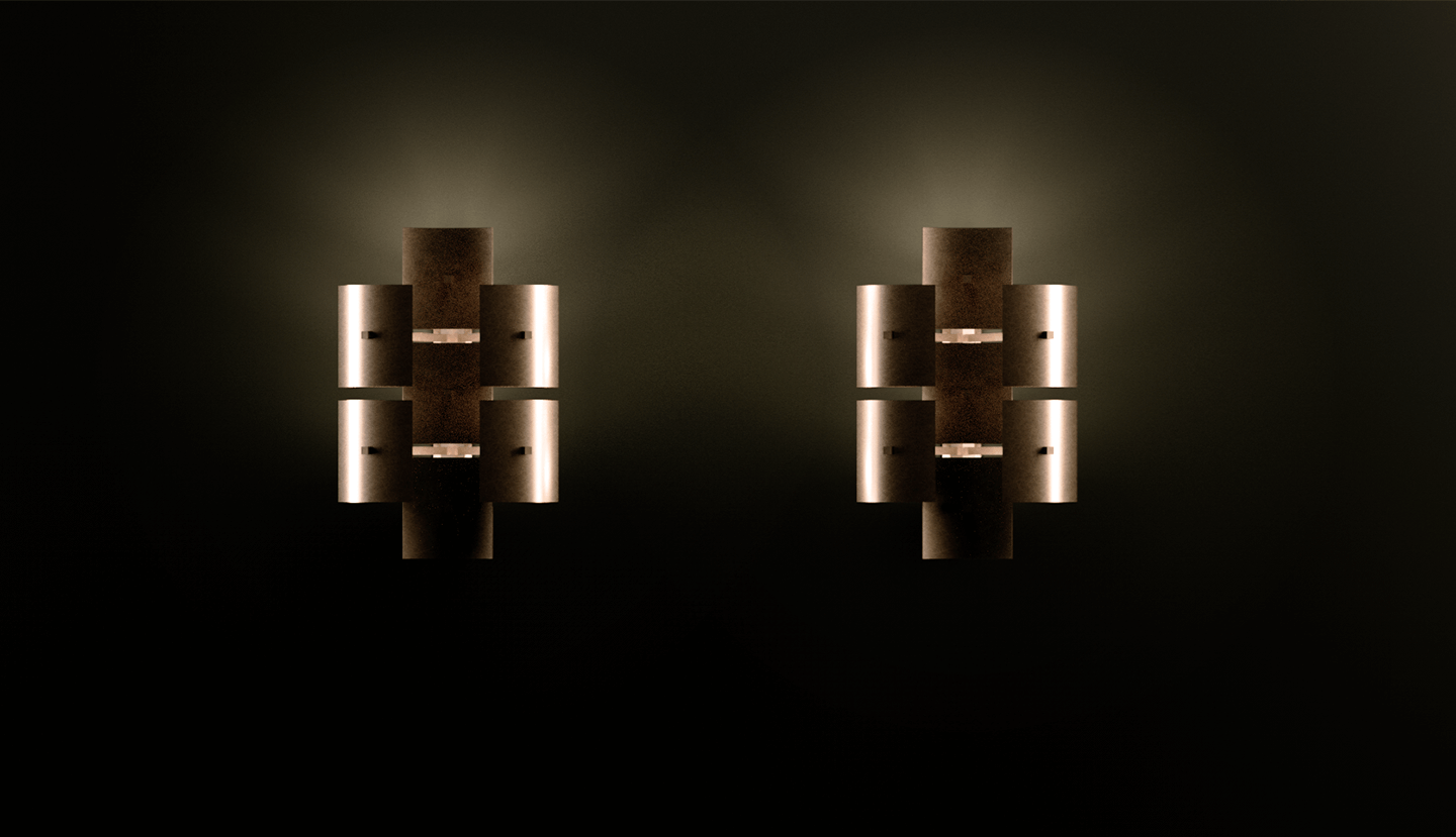 A series of sparkling branches and metal lampshades, where the glossy and satin finishes are fascinating mirror effects. Versatile for every room, the series consists of a hanging chandelier, table lamp, wall lamp.APPLIQUE: Wall lamp made up of lampshade elements in metal with galvanic bronze finish, satin-finished shade and glossy varnishing on the outside.