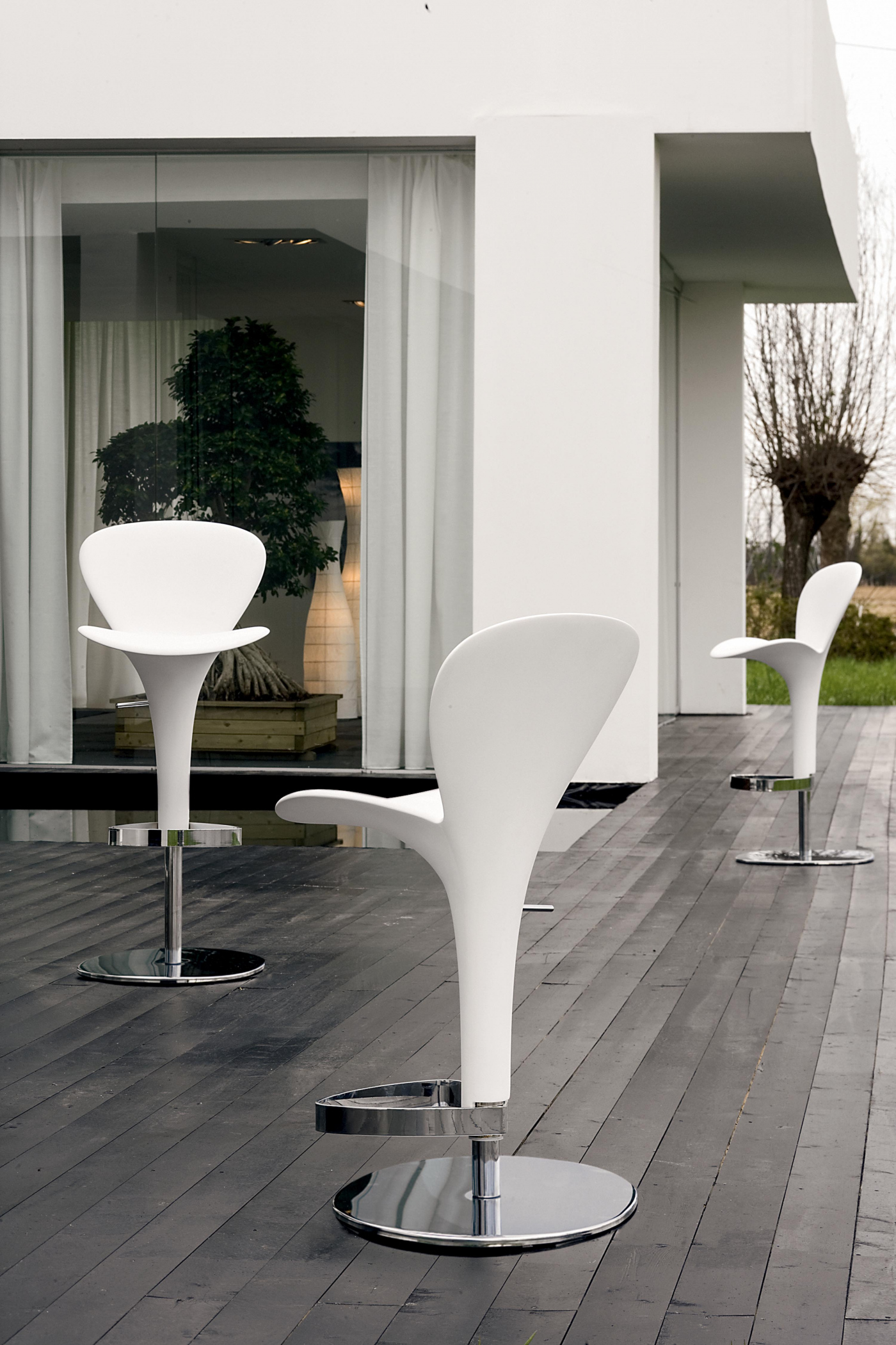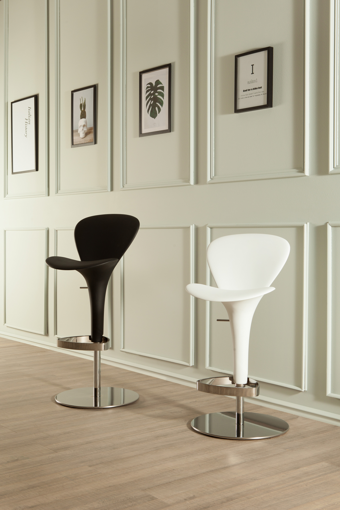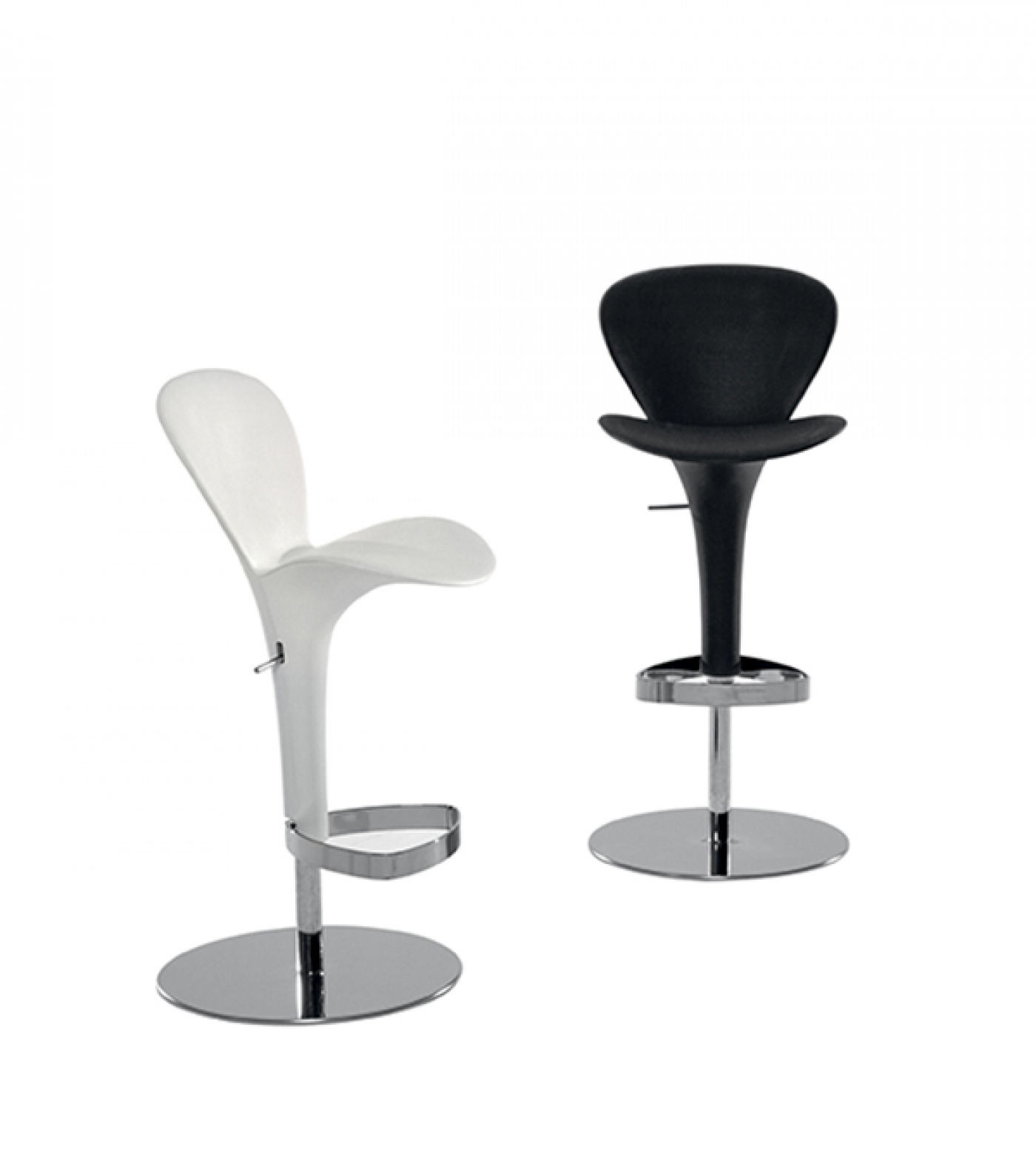 This is a swivelling stool, with a chromed metal base, and a free-form tech seat that makes it the perfect companin for your high furniture, you counter-tops, and your bars.