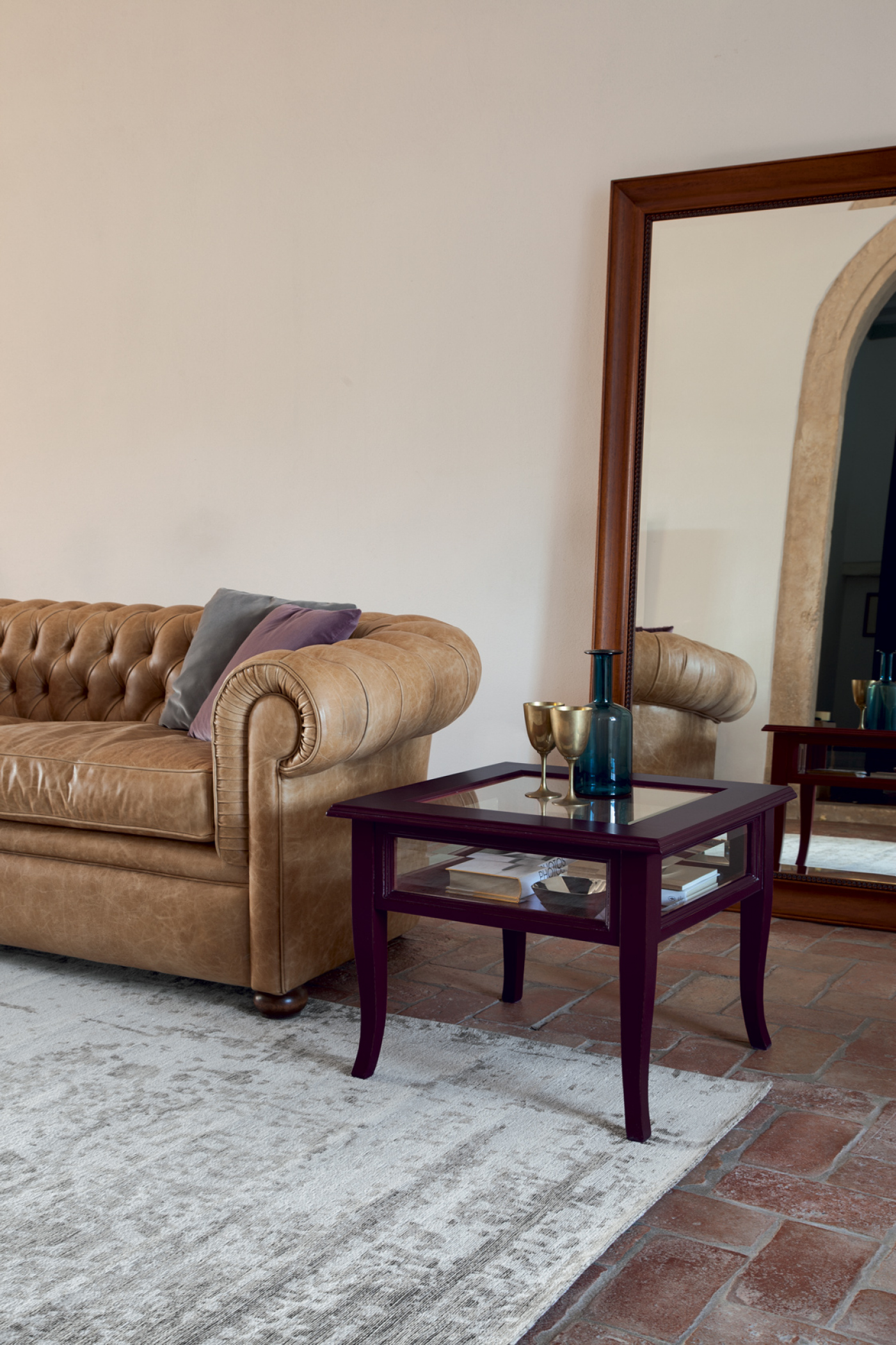 Palmero is a square table, provided with a tiny showcase. Bevelled glass makes it a unique and gracious object, a classic-looking novelty.