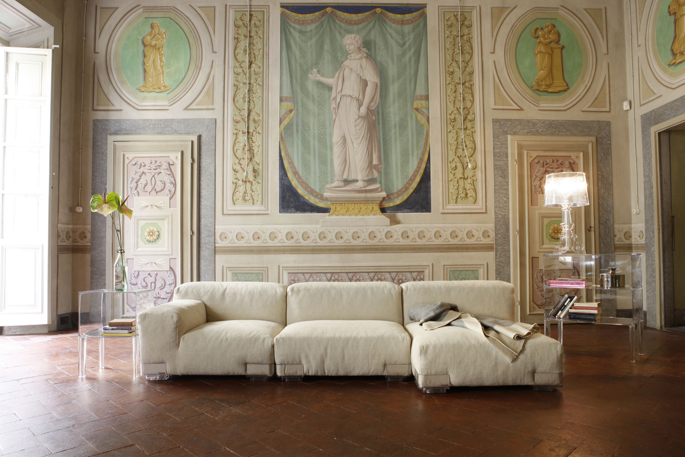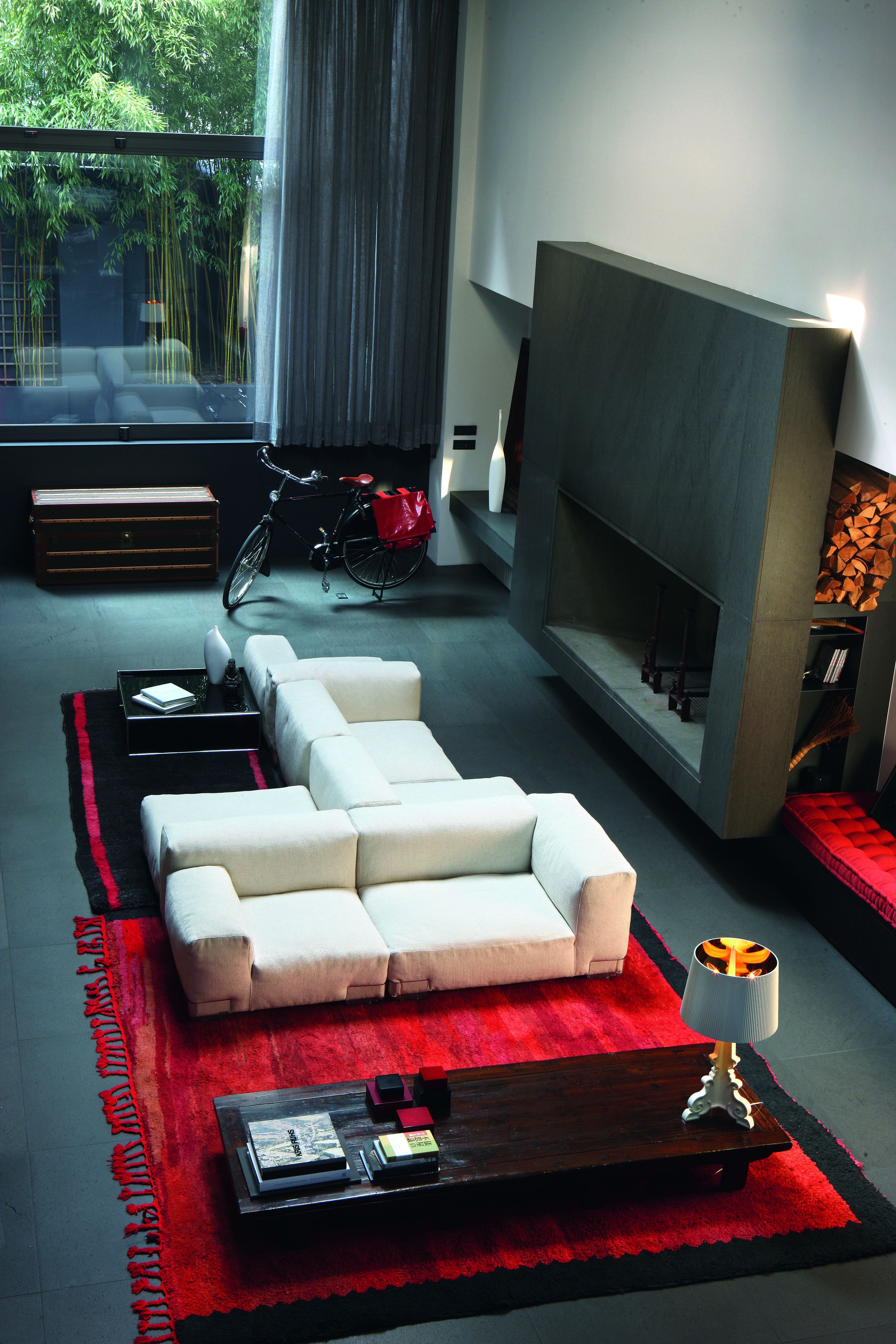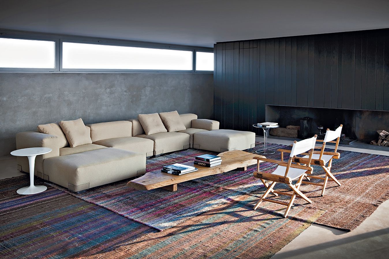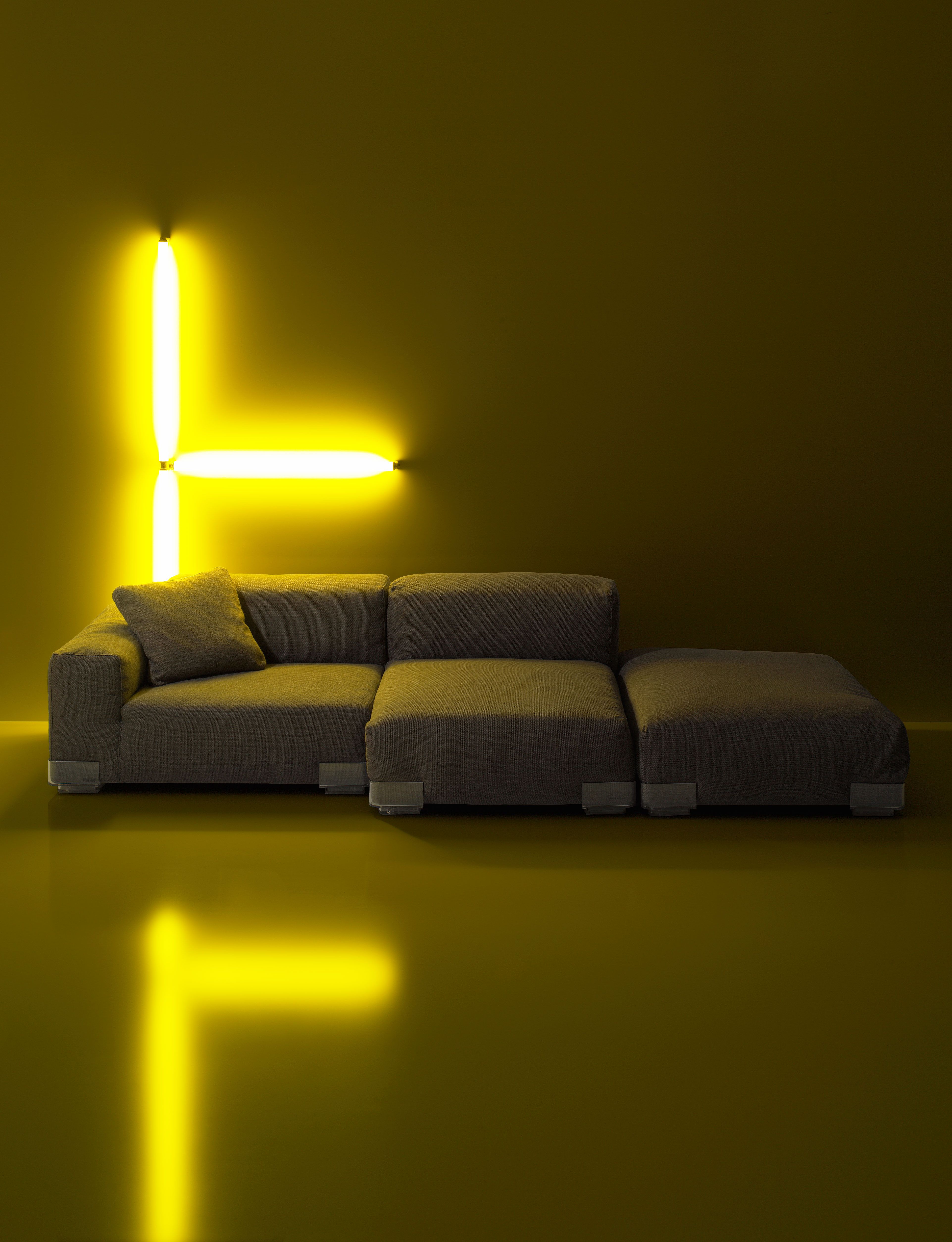 Plastic Duo is the modular sofa with severe lines characterised by large cushions made of goose feather and flock. The Pop collection is completed by an armchair with the same features and by a pouf, which can be used individually or as part of an arrange