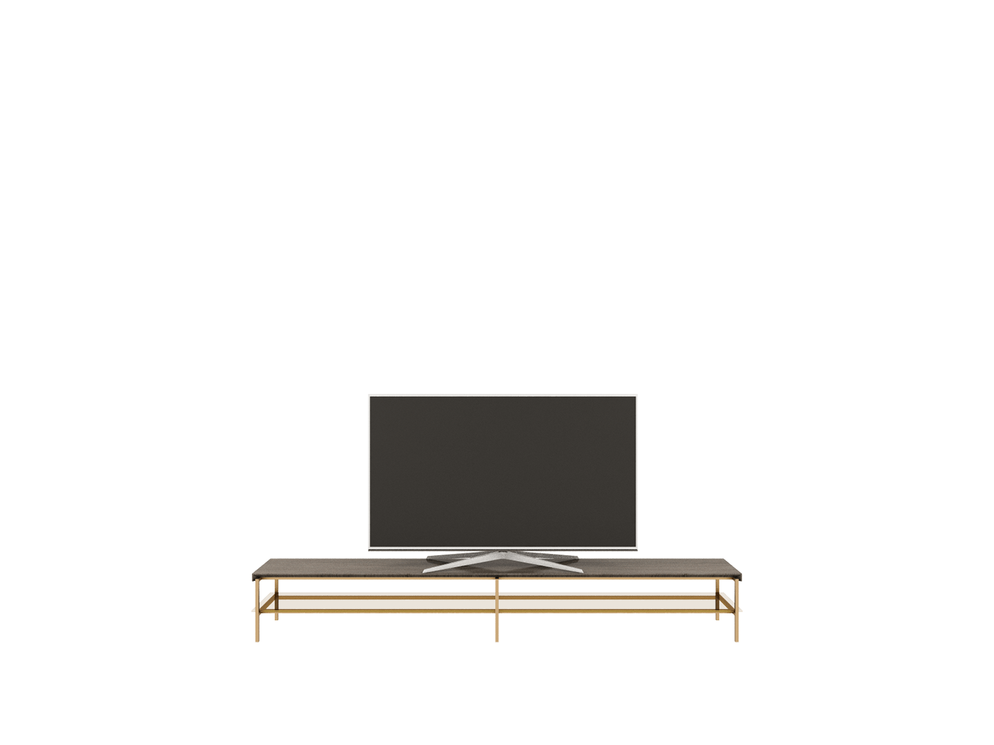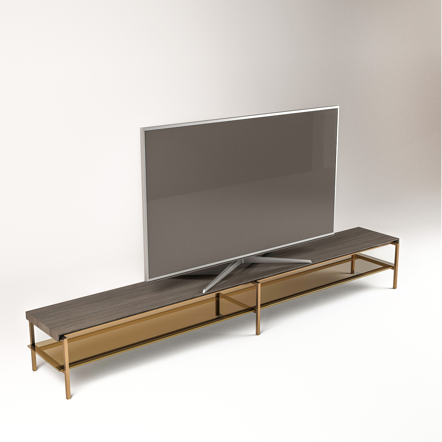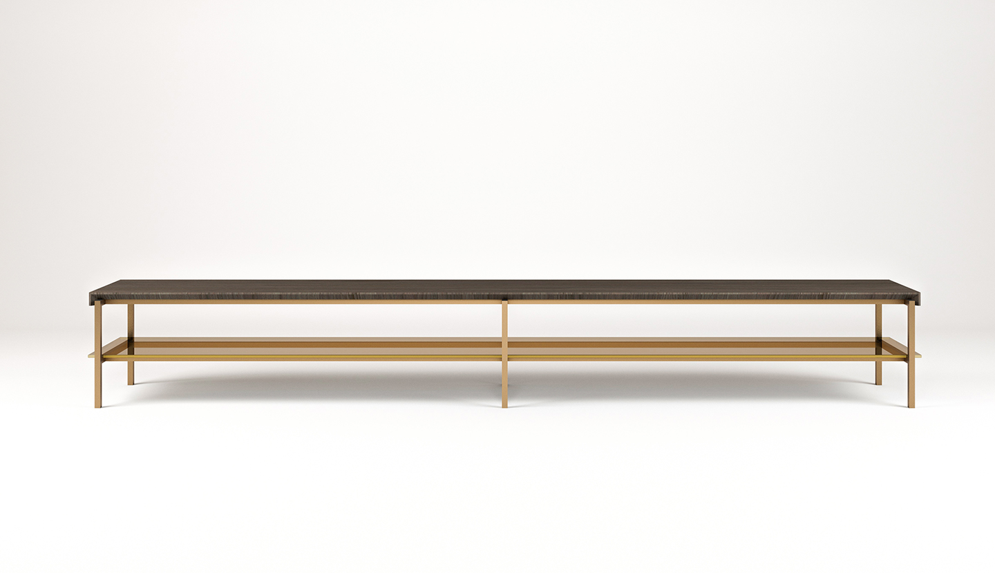 The research of its materials makes Socrate Low an essential object of design, which furnishes the space with a discreet elegance.Socrate Low is made of a square section tubular metal structure, finished in finishing mat bronze shadow.The top shelf is made of ash-coloured elm, while the mid shelf is made of tobacco-brown glass Antelio.