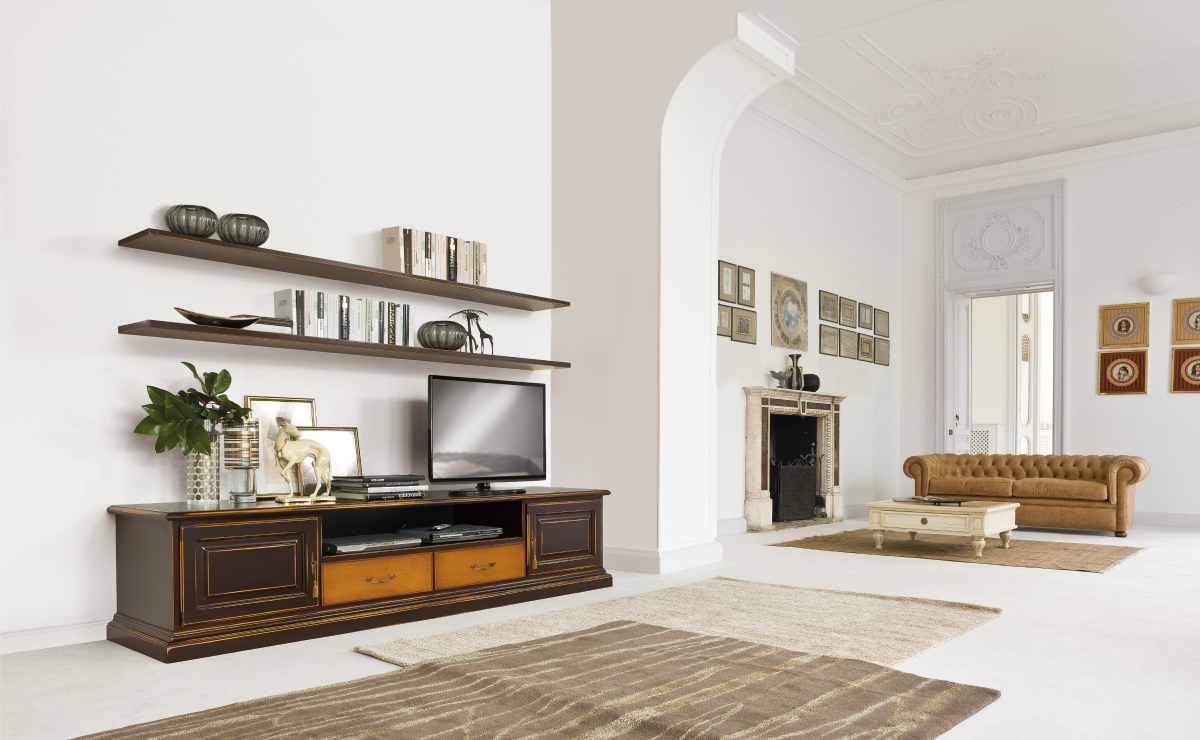 The core, layed on the ground, with drawers and storage units, inserted in an elegant TV-stand. Two lines, halfway through the wall, to support and balance your wall. This is Sofia.