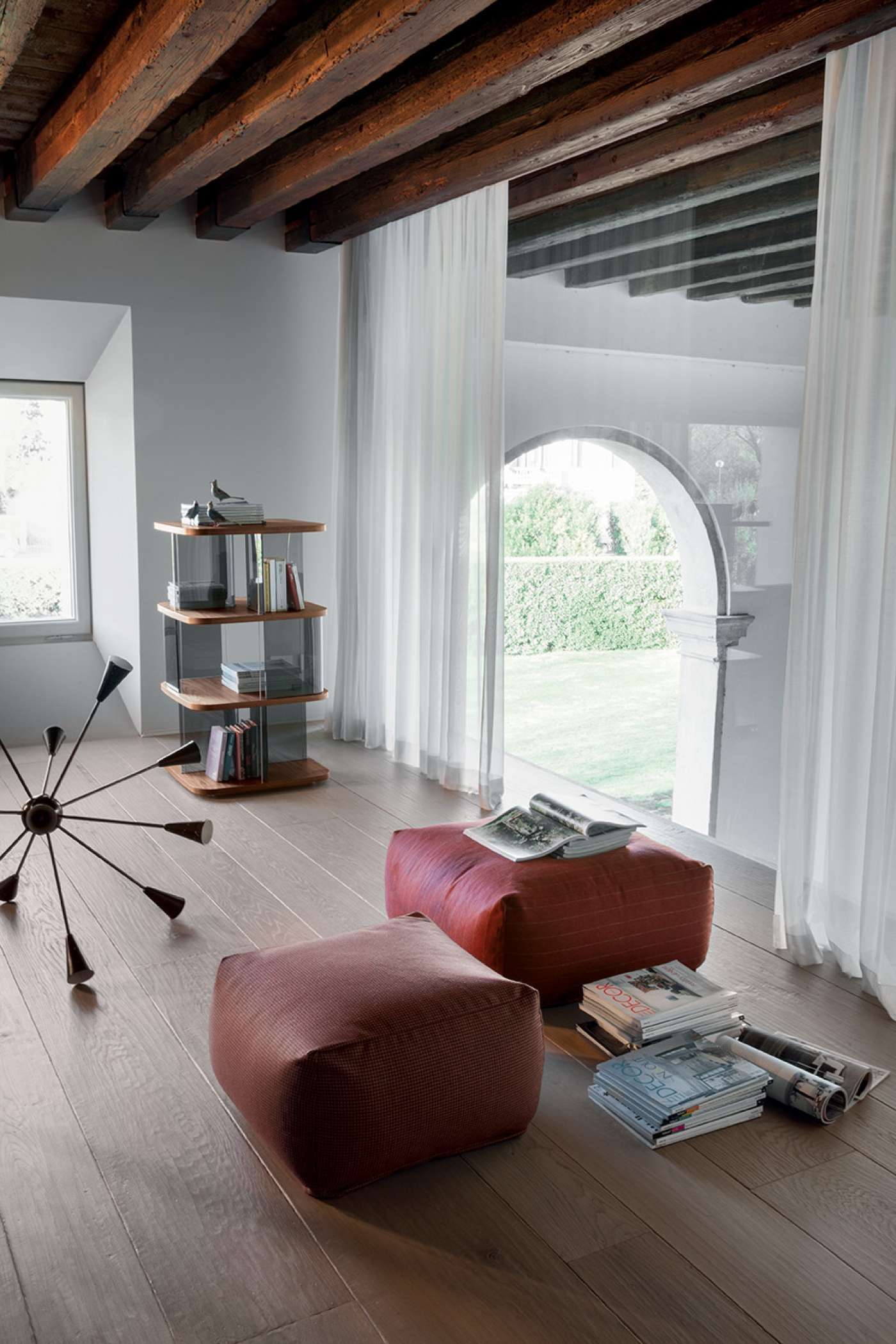 Studio Tonin Creatives designed these poufs, which, at this point are a must-have piece in our collection: the square design and the padding made of expanded polystyrene pearls, make them both comfortable and functional. There are two different sizes, both covered in eco-leather. Starting from this year, another two new fabrics are available: a pinstriped fabric, and a pied-de-poule.