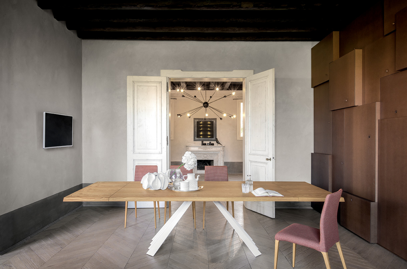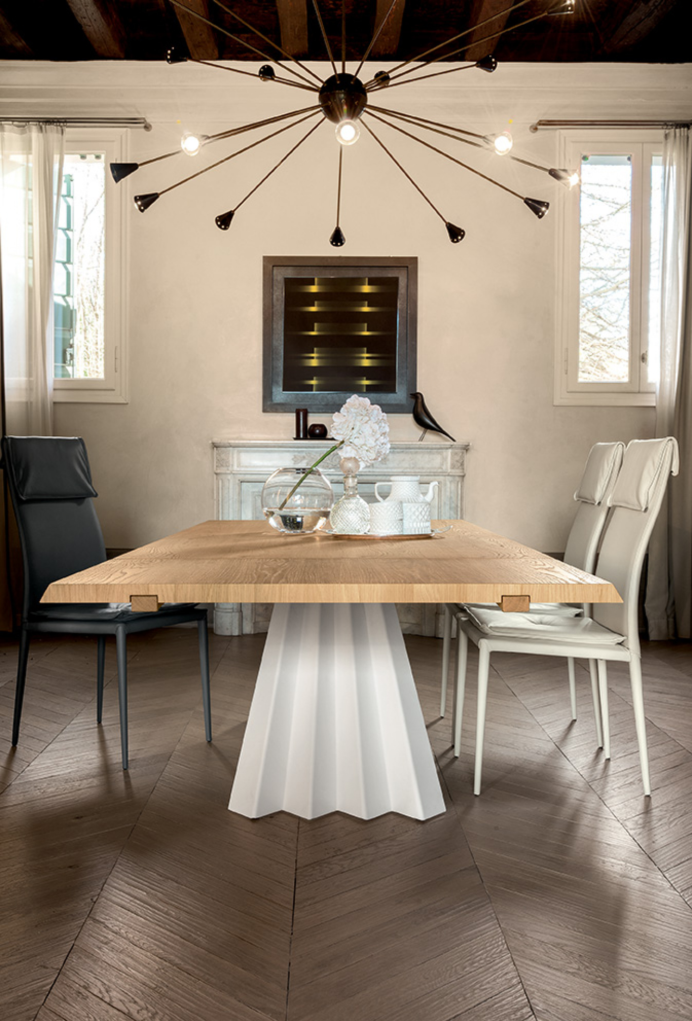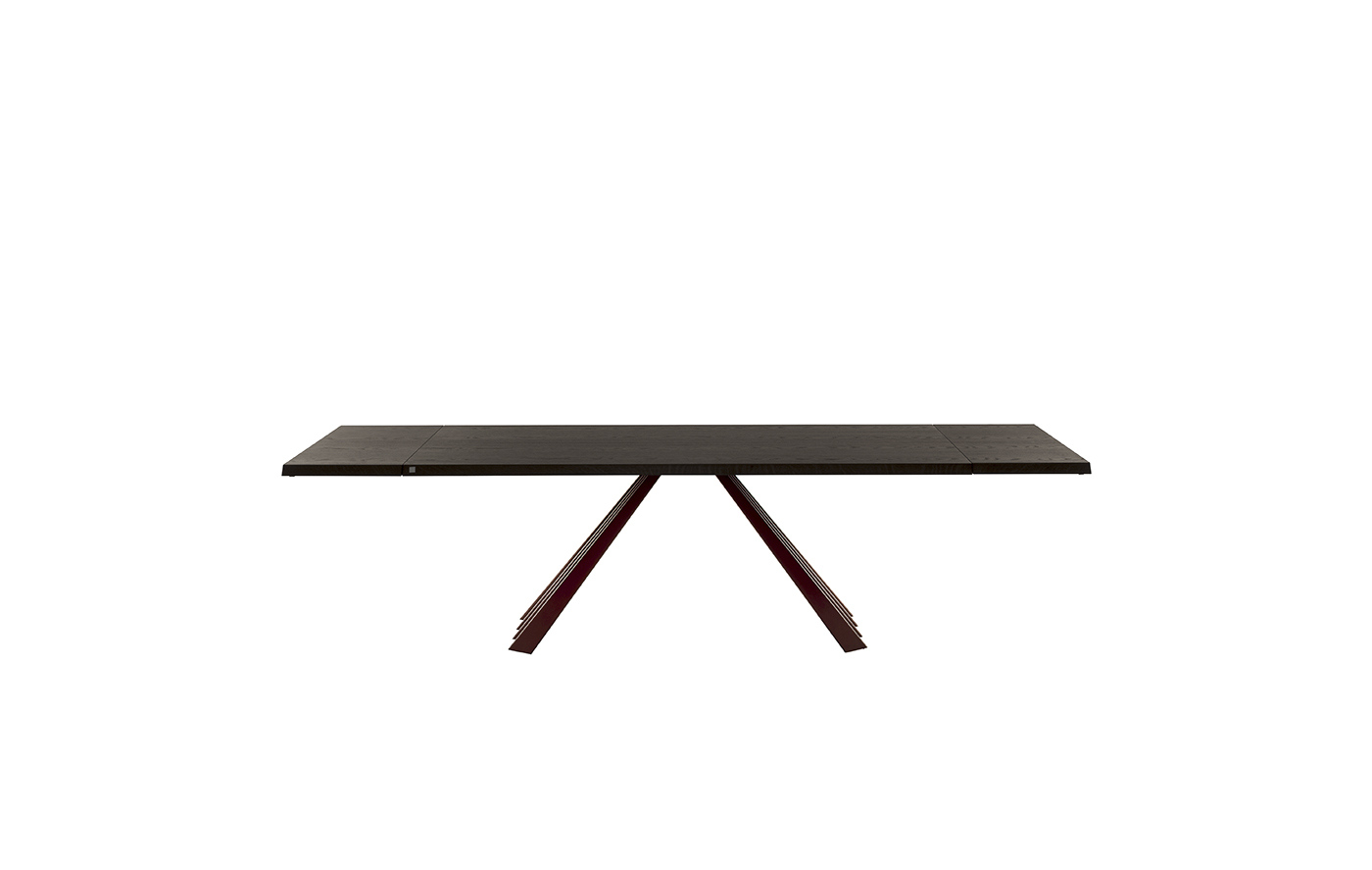Ventaglio was conceived in Italy, and made out Italian raw materials. It offers the perfect combination of craftsmanship and quality. The curved metal legs, main characteristic of this table, can be varnished with different colors. Glass, tempered glass and wooden tops are available, both fixed and extendible. Uncover the elegance of its design with the extendible, wooden version. Solid wood provides further endurance and beauty: a whole board, warm and resistant, elegant and classic, standing out, above the contemporary base.